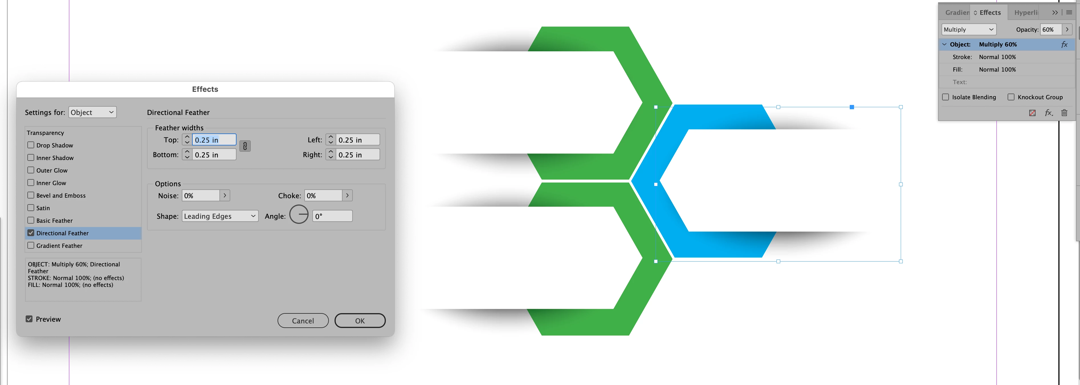 Using a drop shadow effect will only act as an extension of a shape so it won't work to make a shadow that does not reflect the contour of the shape. It needs a workaround. In the screen shot below I made the custom shadows by first drawing an ellipse to roughly the shape I needed, filling it with black and applying the Directional Feather Effect using the settings shown. I then moved the shape backward in the stacking order to be behind the shape that needed the shadow and applied the opacity and Multiply as shown in the Effects Panel.