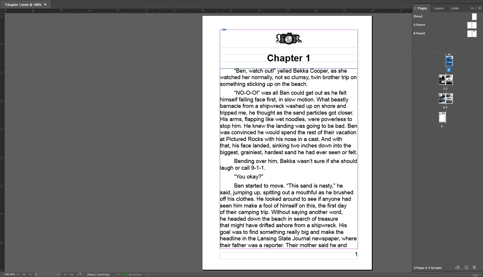 As you can see, the first page is set up with a simple placeholder for an icon at the top of each page, a separate text box for the Chapter heading, and then a text box for the body text. The Parent page for the rest of the chapter is formatted as required. As you scroll through, you'll notice things look great. However, when the chapter is exported to a PDF, as shown in the last image, the outside margin is on the inside, and the page numbers are reversed. I added a thin border line to the text boxes to make the margins stand out.
