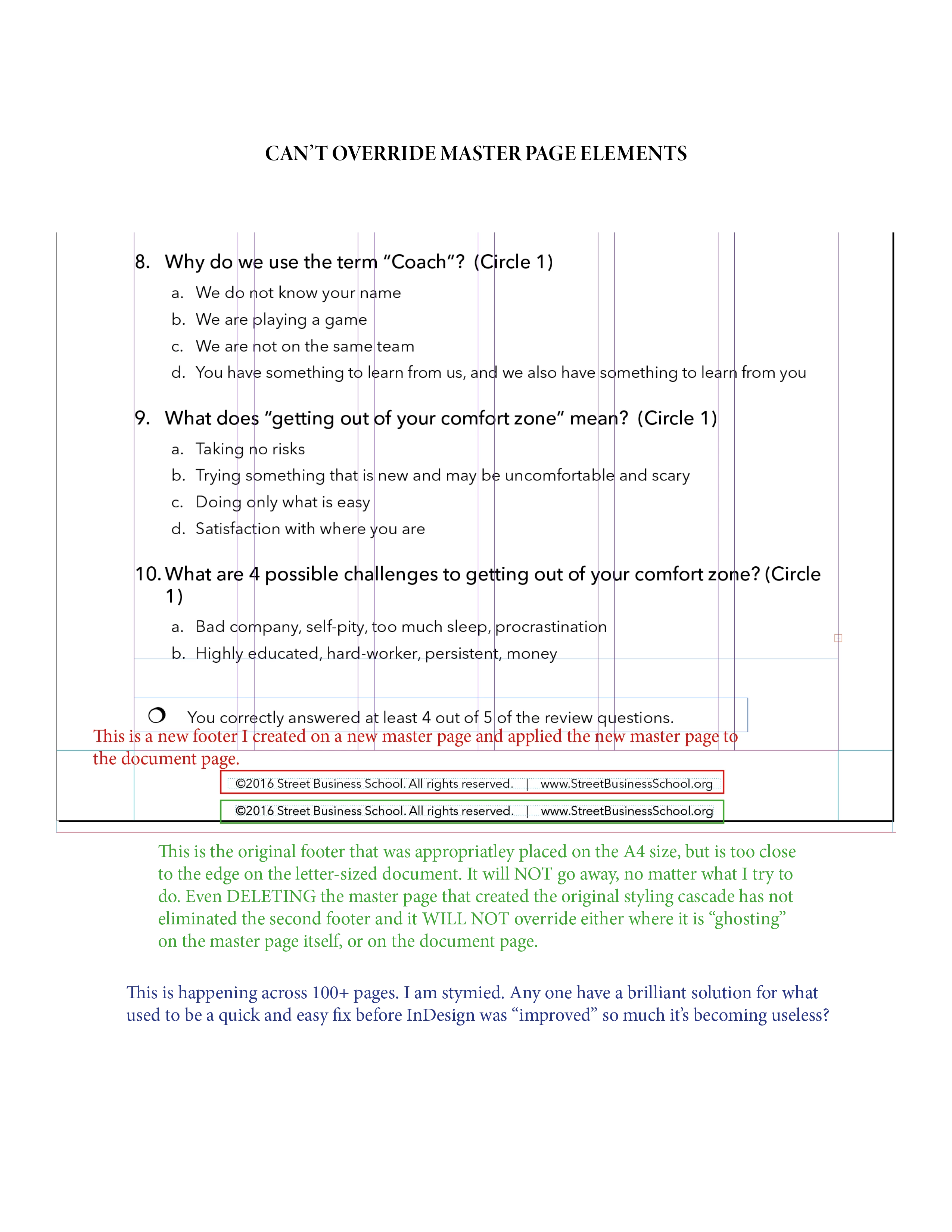 I just completed a long document designed as A4. Now I have to also convert it to US letter. Much of the document resized when I changed the sizing in document setup (file menu), but some of the master page items did not auto-"relocate" themselves. However, when I attempt to move these master page items—either on the master page, OR using an override, these elements appear locked. Even if I try to set up a new master page and apply that to the "child" master page, the incorrect item that is resisting the override, is STILL there, now creating duplicate footers on all of the pages where the original footer first appeared. SO many of the original deisgn features of InDeisgn that made it such a joy are now buggy as you attempt to "improve" this once wonderful and dependable product. PLEASE don't reinvent the wheel if you make the engine die every time you try to start the car with the shiny new hubcaps