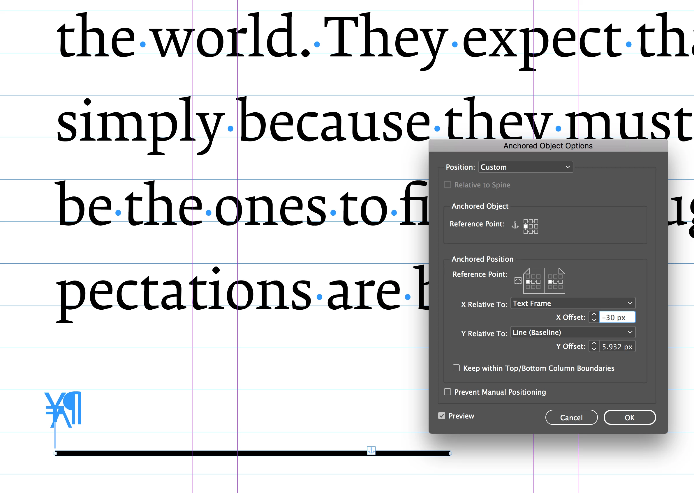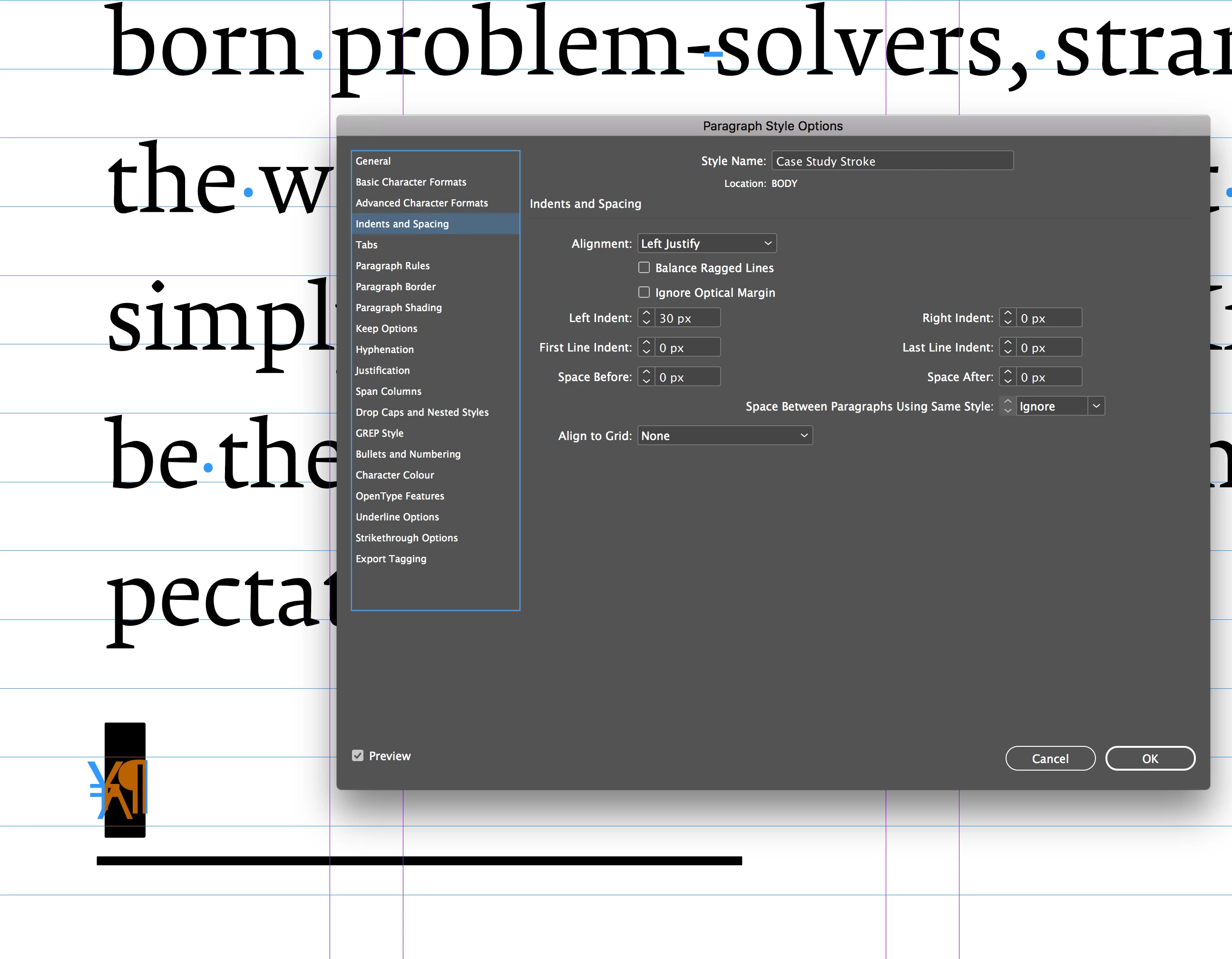 The stroke is custom anchored to it's own para style which is indented to 30px.