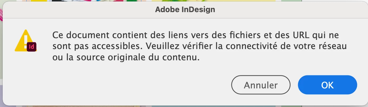 j'ai un soucis depuis plus d'un an avec indesign : lors de la mise à jour de celui-ci, si je reprends un document créé avec une version antérieure, voici le message que j'ai lorsque je génère un pdf ;