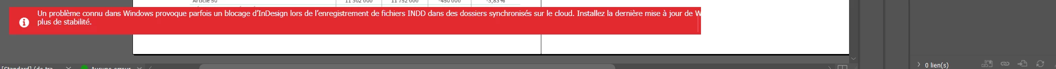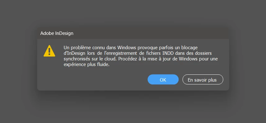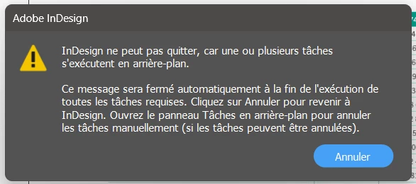 Bonjour, je viens de tester la mise à jour InDesign 21.3 sur Windows 11. J’ai une petite fenêtre rouge en bas d’écran qui me demande de tenir Windows à jour. Je ne peux pas fermer cette fenêtre rouge. Et comme je suis dans une grande entreprise, je n’ai pas la possibilité d’intervenir sur Windows, c’est une version imposée par l’entreprise et sécurisée. Je ne peux pas non plus quitter InDesign qui me dit qu’il y a une tâche en arrière plan, mais si j’ouvre la fenêtre “tâches en arrière plan” ,il n’y a rien. Je viens donc de revenir à la version 21.2 qui fonctionne sans problème. Une solution ?