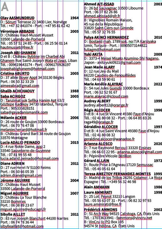 Précision (voir capture d'écran) : mes colonnes de texte sont chainées entre elles, pour que le texte coule de page en page, et je ne peux pas créer plusieurs blocs de texte les uns sous les autres car la longueur des coordonnées diffère d'un nom à l'autre.