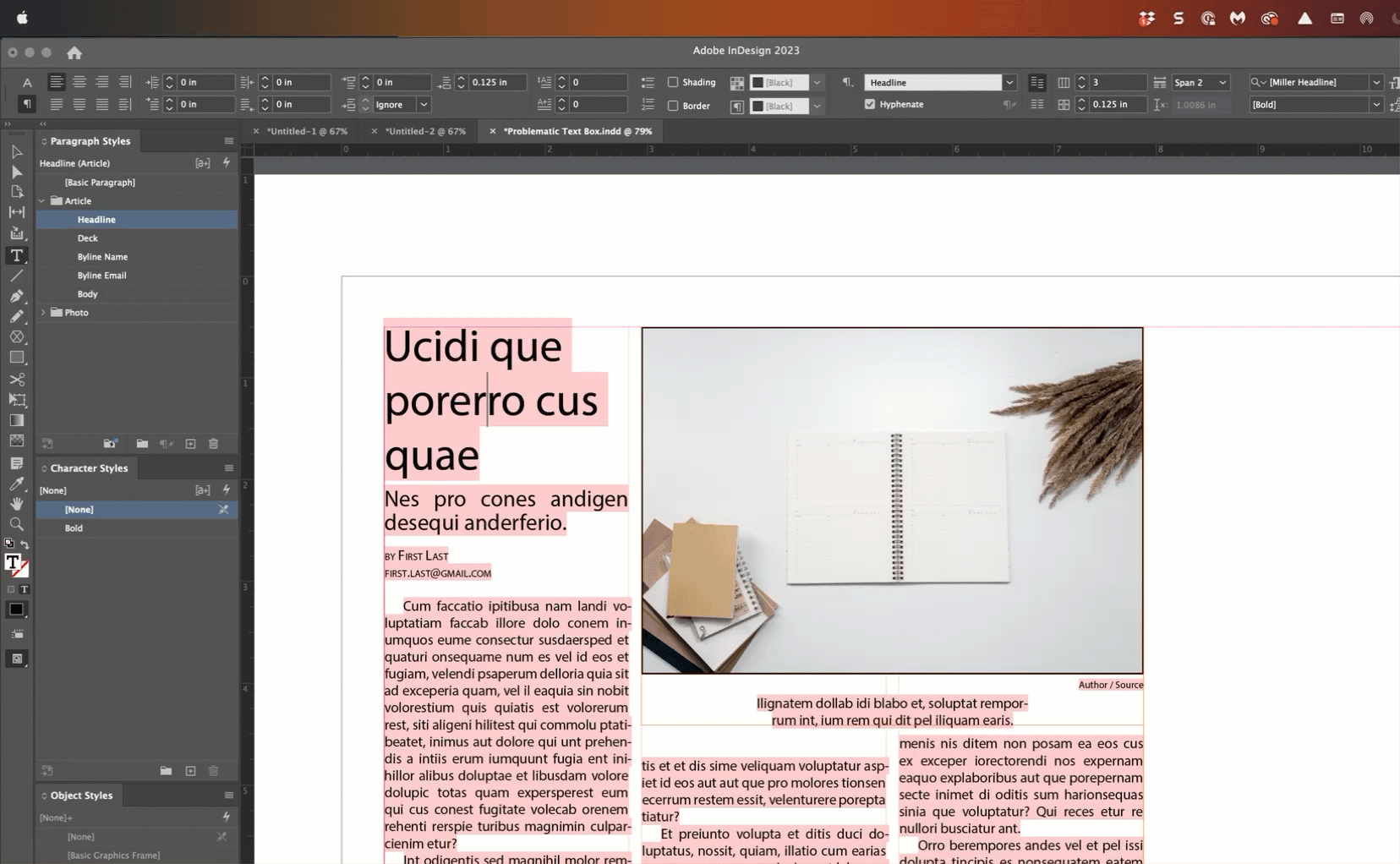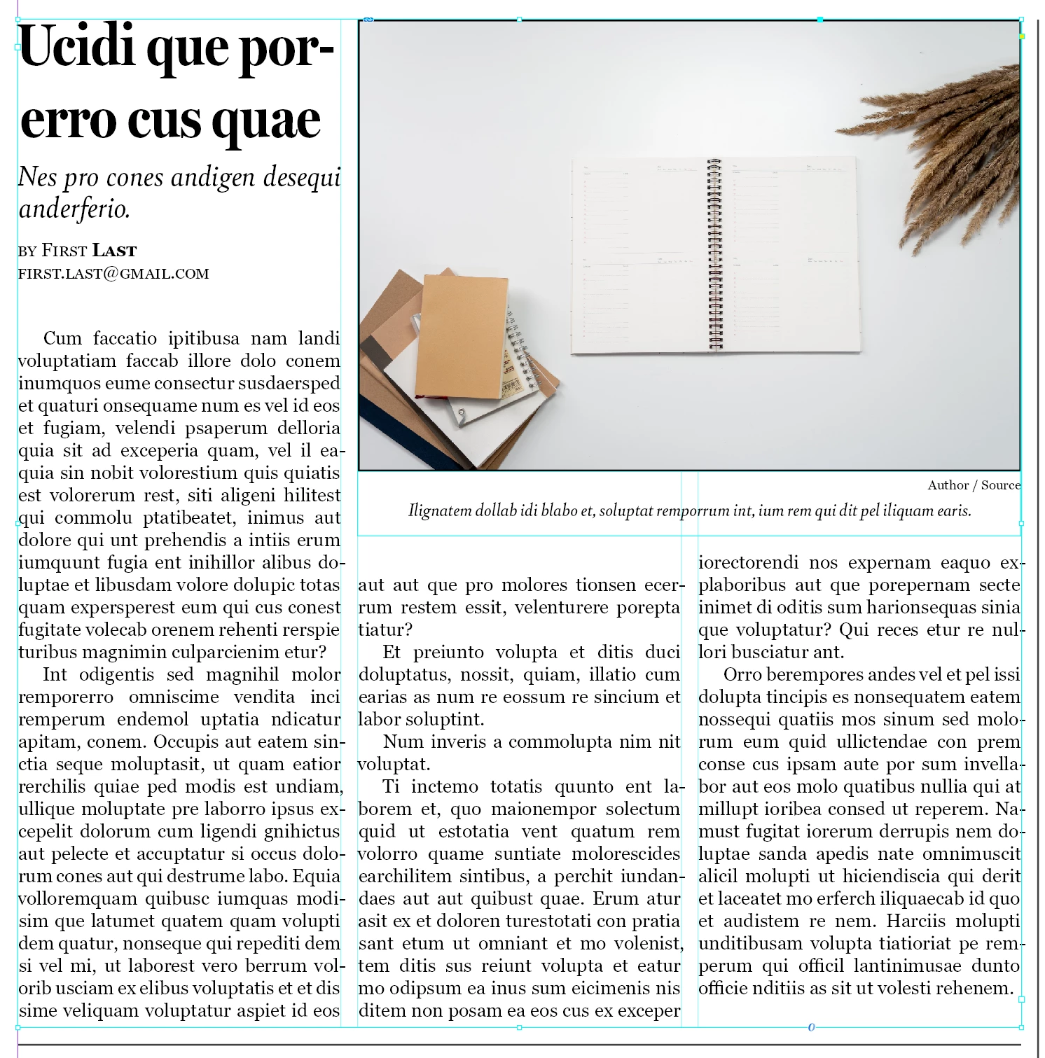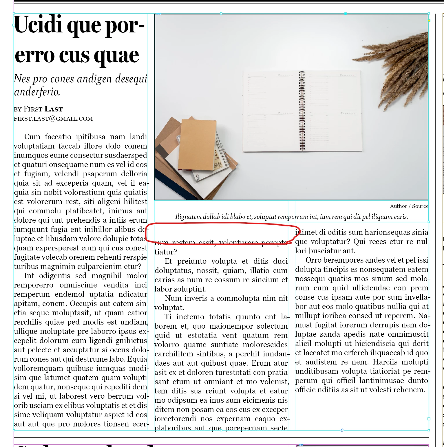 I have a large textbox with an article header, byline, and body. It has three columns of text. On top of this text box, I have an image and a caption box that I can move to fill the space. Sometimes the text in the second and third columns is misaligned. I want the text to start right underneath the caption, but in the second column, it skips a line.