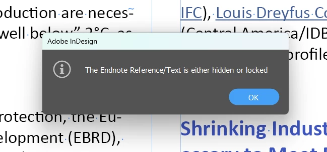 I'm importing text from a word document into InDesign, and the word doc already has endnotes, links, and superscript endnote numbers. The problem is when I File>Place the text into InDesign, everything shows up except for the superscripted endnote reference numbers. The crazy thing is if I right-click on an endnote, and click "Go to endnote reference", InDesign will navigate to the correct page, but I get the warning below.