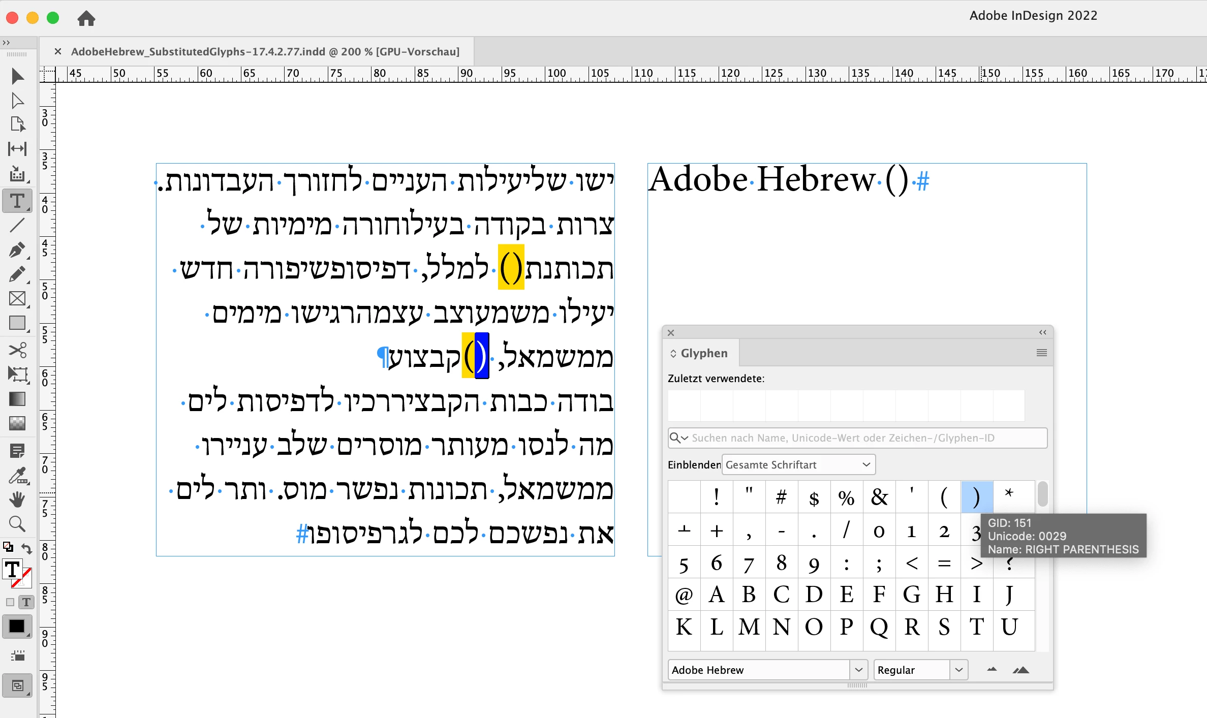 I tried with various fonts, all behave the same. Today was the first time I noticed it. It happened with a document that I edit all the time (and also a new one I created to test it) when I selected a different paragraph style. I then got a message that there are missing glyphs. I turned on the highlight option and suddenly I notices that all my parenthesis are highlighted in yellow for missing glyphs. I believe it is a bug of the latest version.