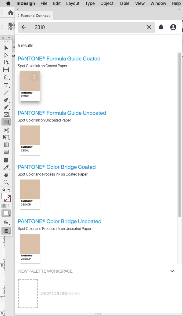I have selected a color through my "Formula Guide Solid Coated" printed swatch. The color is the Pantone 2310 C and somehow I can't find it in the Indesign "solid coated" digital swatch. Any clue why and where to find it?