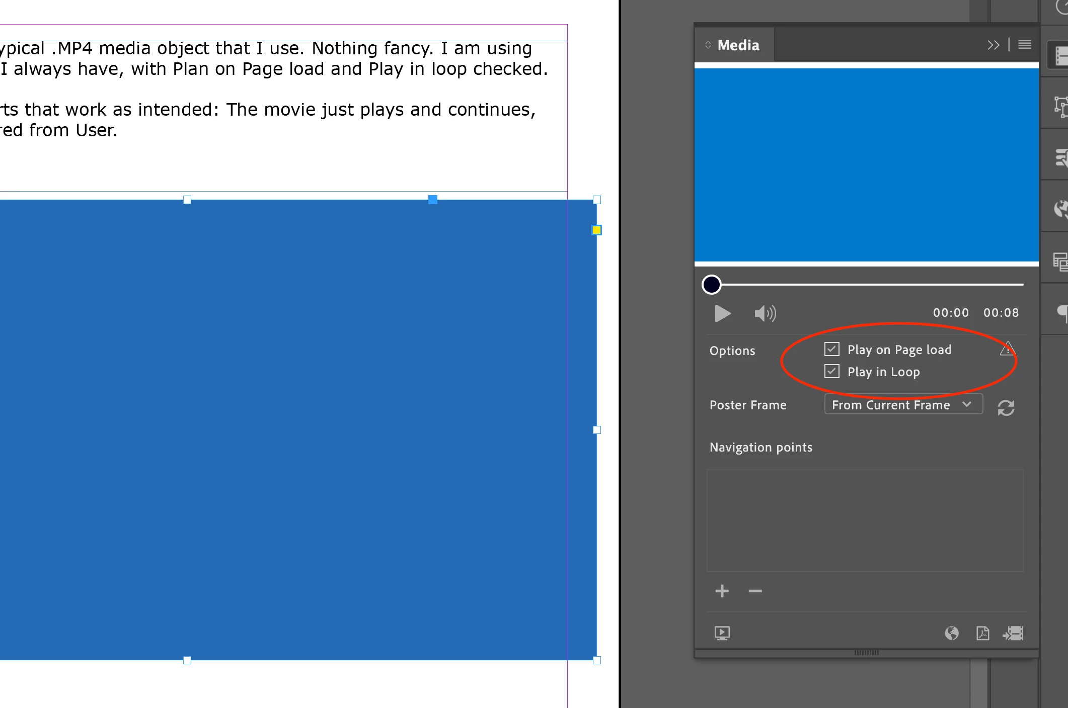 I routinely add stock or self-made AE or AN mp4 videos to epub docs. Generally animations that spice up the pages as accents. Usually pretty small and ornamental. In the Media panel, I check the boxes, Play on Load, and Loop. This has worked fine for years. Today, working on a new project, these checked boxes no longer cause the media to play. It's necessary to click the Play button in order to get them to work.