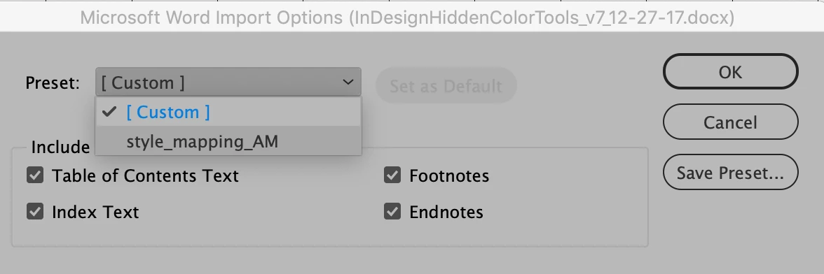 If you're repetitively doing Style Mapping when importing Word files, you must set up a Preset by using the Save Preset button. The saved Mapping shows up in the Preset menu: