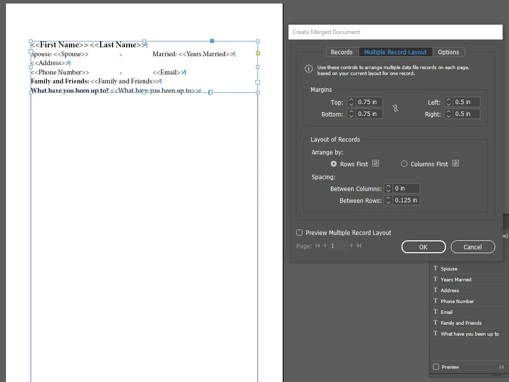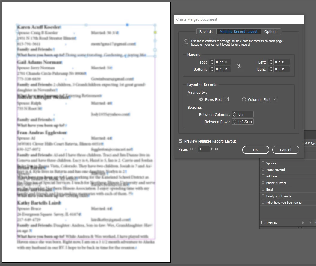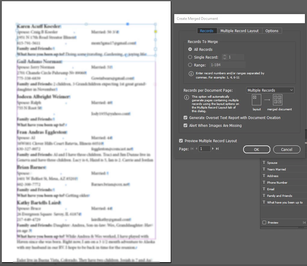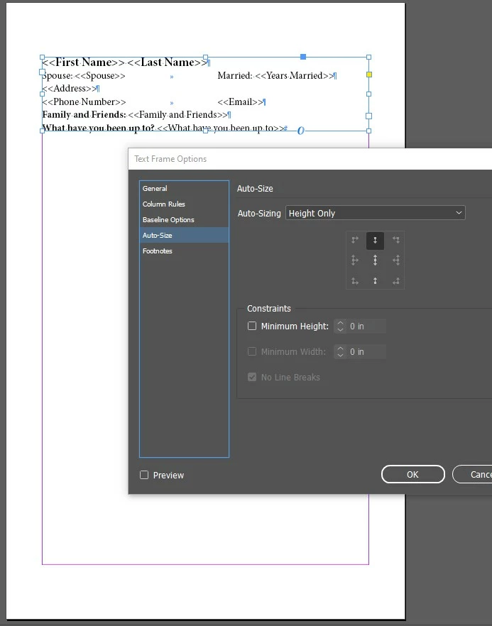 I am working on a 5.5 x 8.5 Class Reunion Directory. There are several lines of data in the merge and a few of them "Family and Friends" and "What have you been up to" can get quite wordy. I used the Auto-size option in Text Frame Options to allow the frames to expand for the data. However, when I do the multiple record preview, they are overlapping each other. I tried playing with text wrap to see if that would bump the text box down but instead it cuts off the "What have you been up to" data after about 2 lines and then that data continues at the bottom of the page, running off the page.