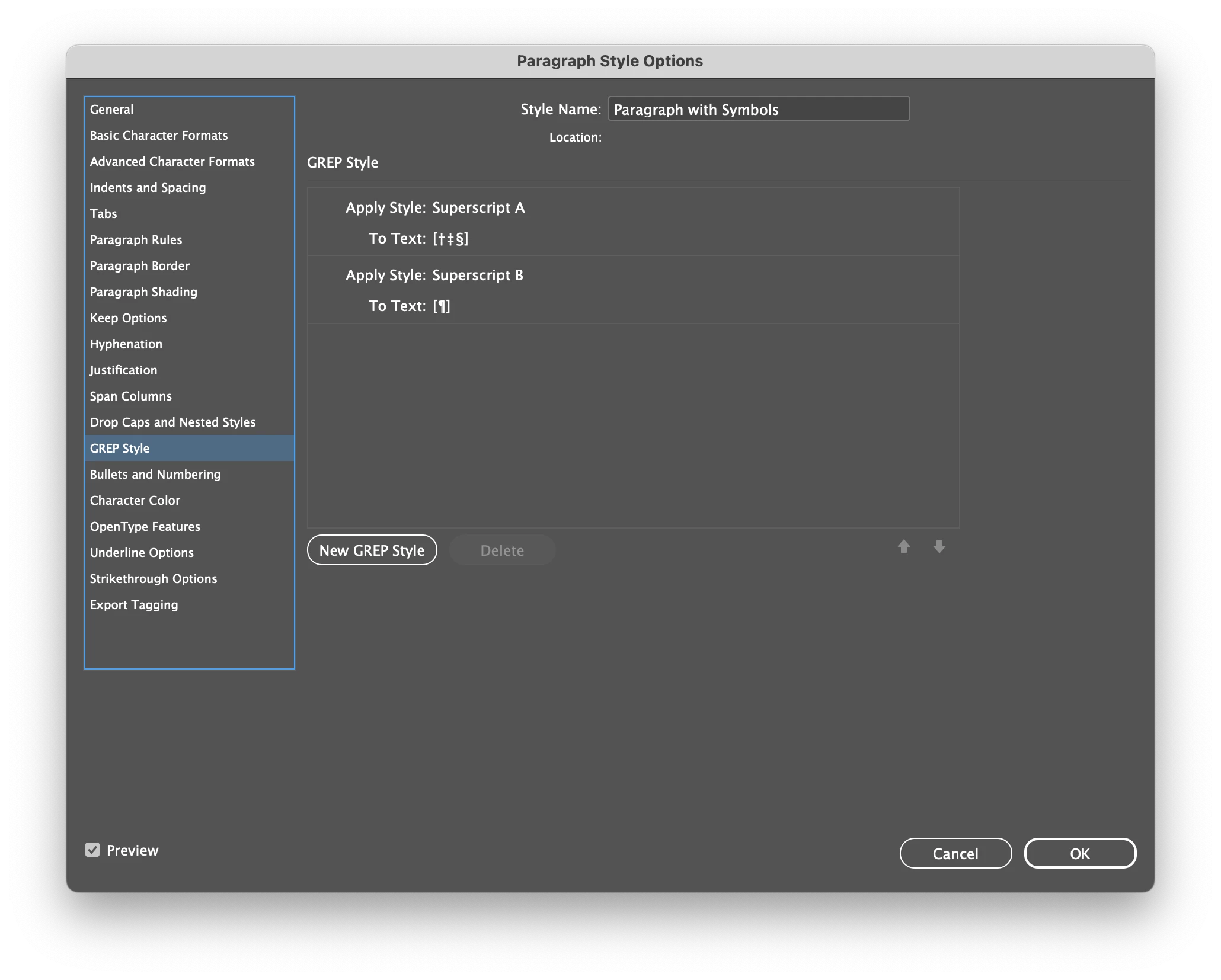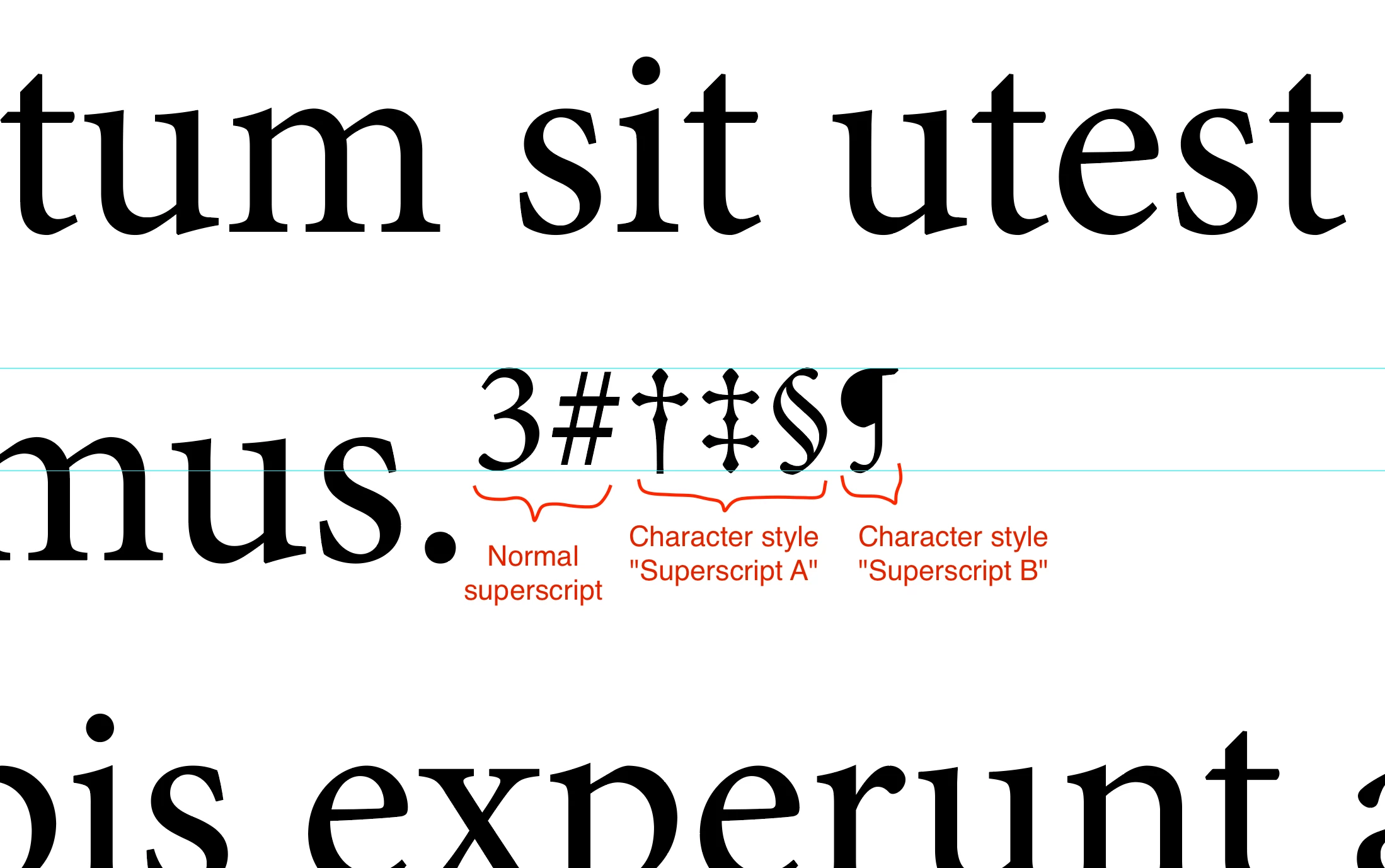I haven't seen this done but hope that it can. On the left is how InDesign handles superscript characters by default, which is clumsy because they don't share the same elevated baseline and they vary in size. On the right is how I wold like for the characters to appear, on the same elevated baseline and the same size. In both examples the "3" and hashtag don't need to be massaged because they have the correct elevated baseline and size by default. I want to change the †, ‡, and ¶ characters only. As we know, the superscript size and position are controlled by the percentages in the Preferences/Advanced Type dialogue. I've used GREP to automate a few things but this is above my skill level. Is there a way, perhaps in GREP, to target specific characters to change these default size and position percentages? Thanks in advance for your help.