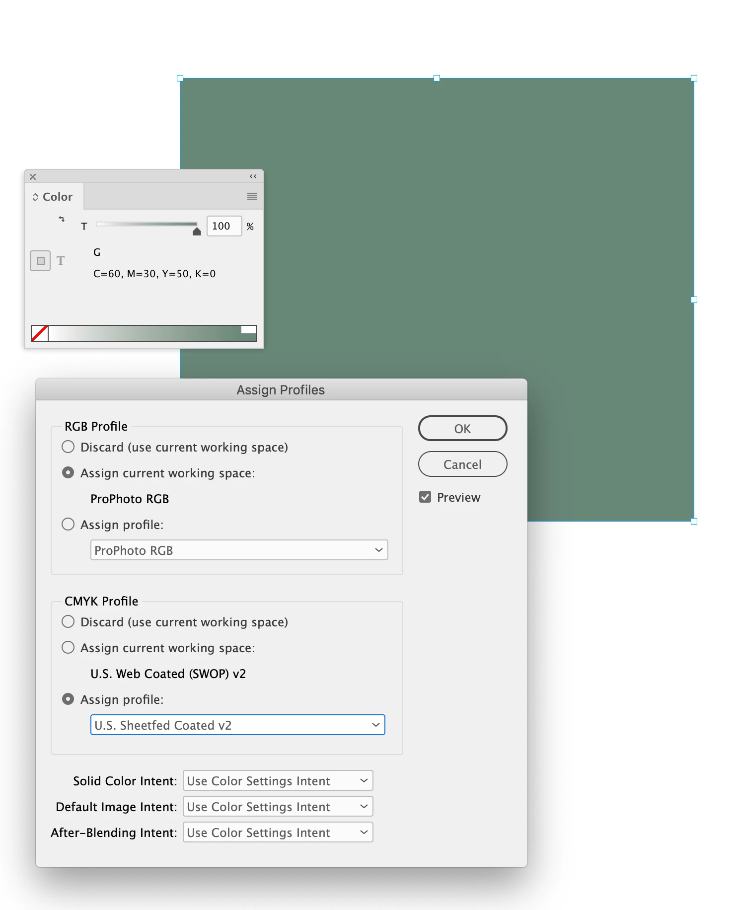 So if you start with a source CMYK color like 60|30|50|0, you can see the value’s appearance changes depending on the assigned CMYK output profile.