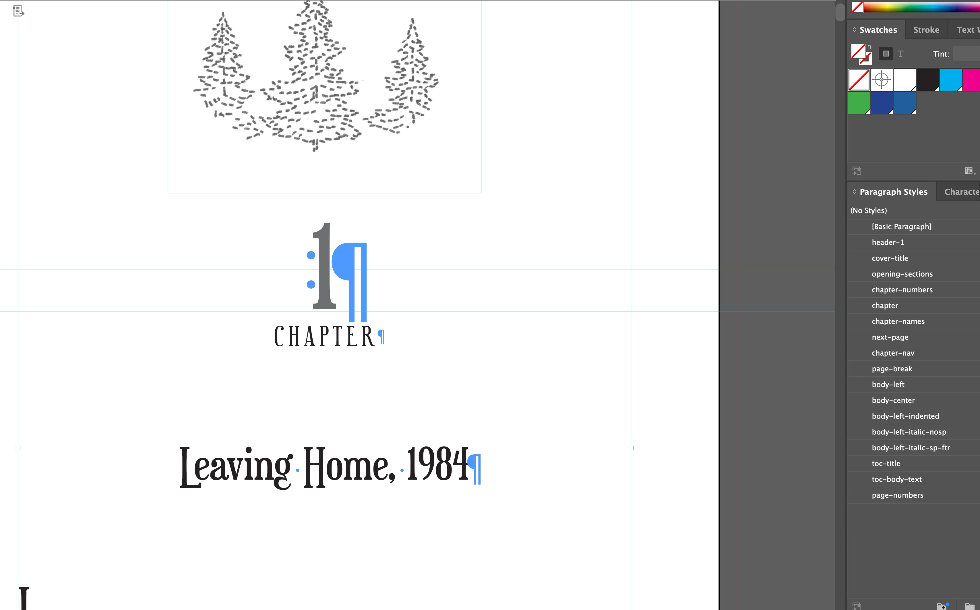 The author wants the TOC in the ePub reader to display Chapter 1 Leaving Home. How would I do this using one style, but still preserve the appearance in the book? Is it possible to add this to the page below the image, create a style with the text size to 1pt, but set the color to be 100% transparent so the eReader picks it up, but invisible to the person reading? The transparent part would have to be done after export, if it's even an option, using RGBA. The problem that might arise is whether the ePub reader supports transparent text. I'm open to other ideas.