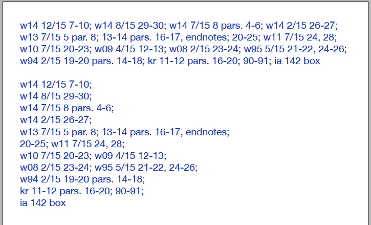 w14 12/15 7-10; w14 8/15 29-30; w14 7/15 8 pars. 4-6; w14 2/15 26-27; w13 7/15 5 par. 8; 13-14 pars. 16-17, endnotes; 20-25; w11 7/15 24, 28; w10 7/15 20-23; w09 4/15 12-13; w08 2/15 23-24; w95 5/15 21-22, 24-26; w94 2/15 19-20 pars. 14-18; kr 11-12 pars. 16-20; 90-91; ia 142 box