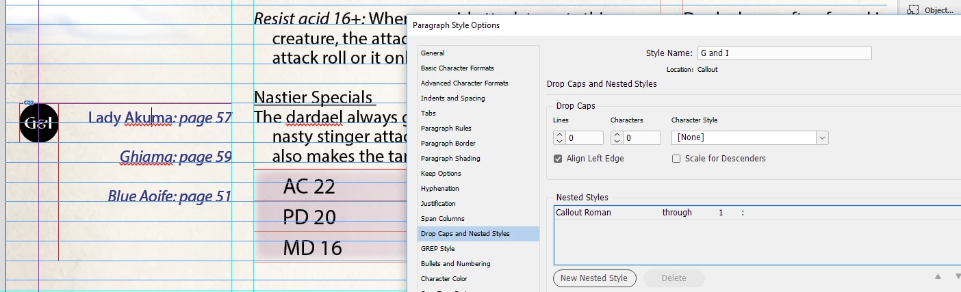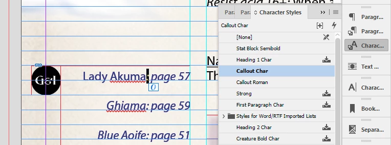 1. Here we can see the cursor is in a paragraph with the style "G and I" and it has a nested style which calls for the character style "Callout Roman" to be used through the 1st ":"