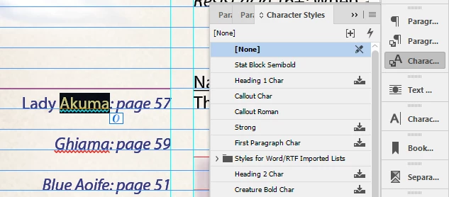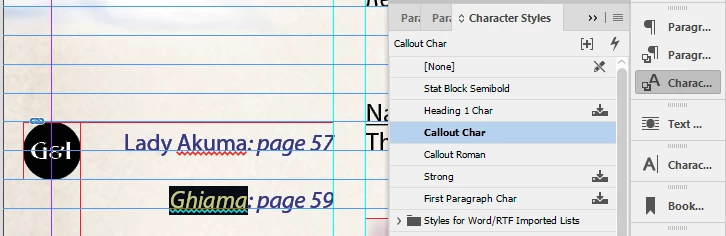 2. Looking at the Character style, we see Callout Roman has not been applied, and the text before the colon has style [None]