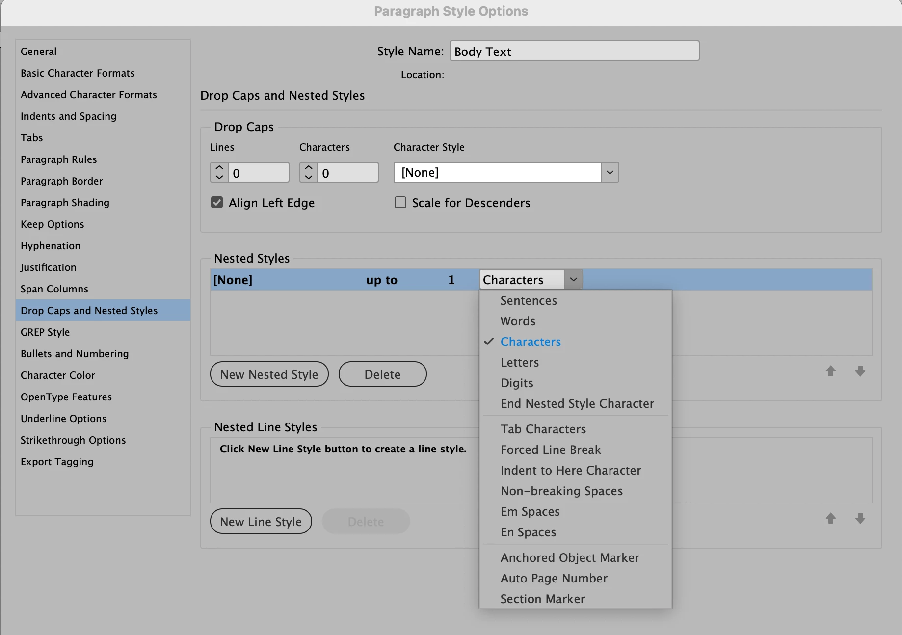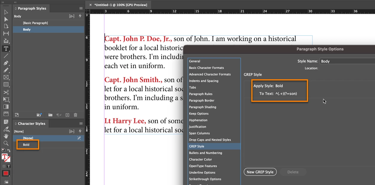 I tried to tell INDD to use the leader style up to the first incidence of the word son, but I have obviously told it wrong. It applys the the leader style to Capt. J only where the leader starts with Capt. John P. Doe, Jr., son of.