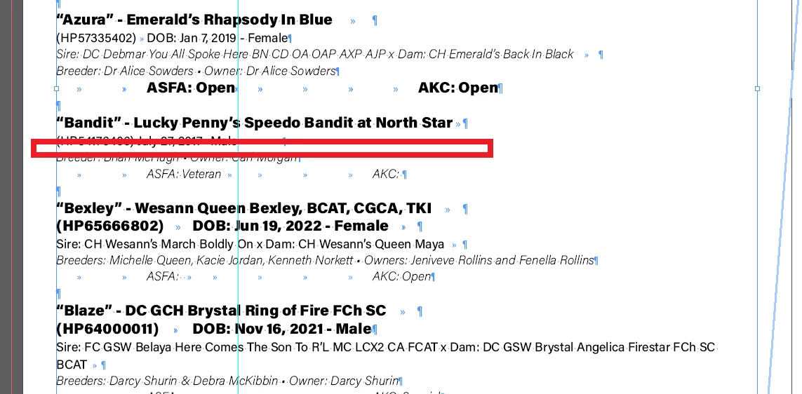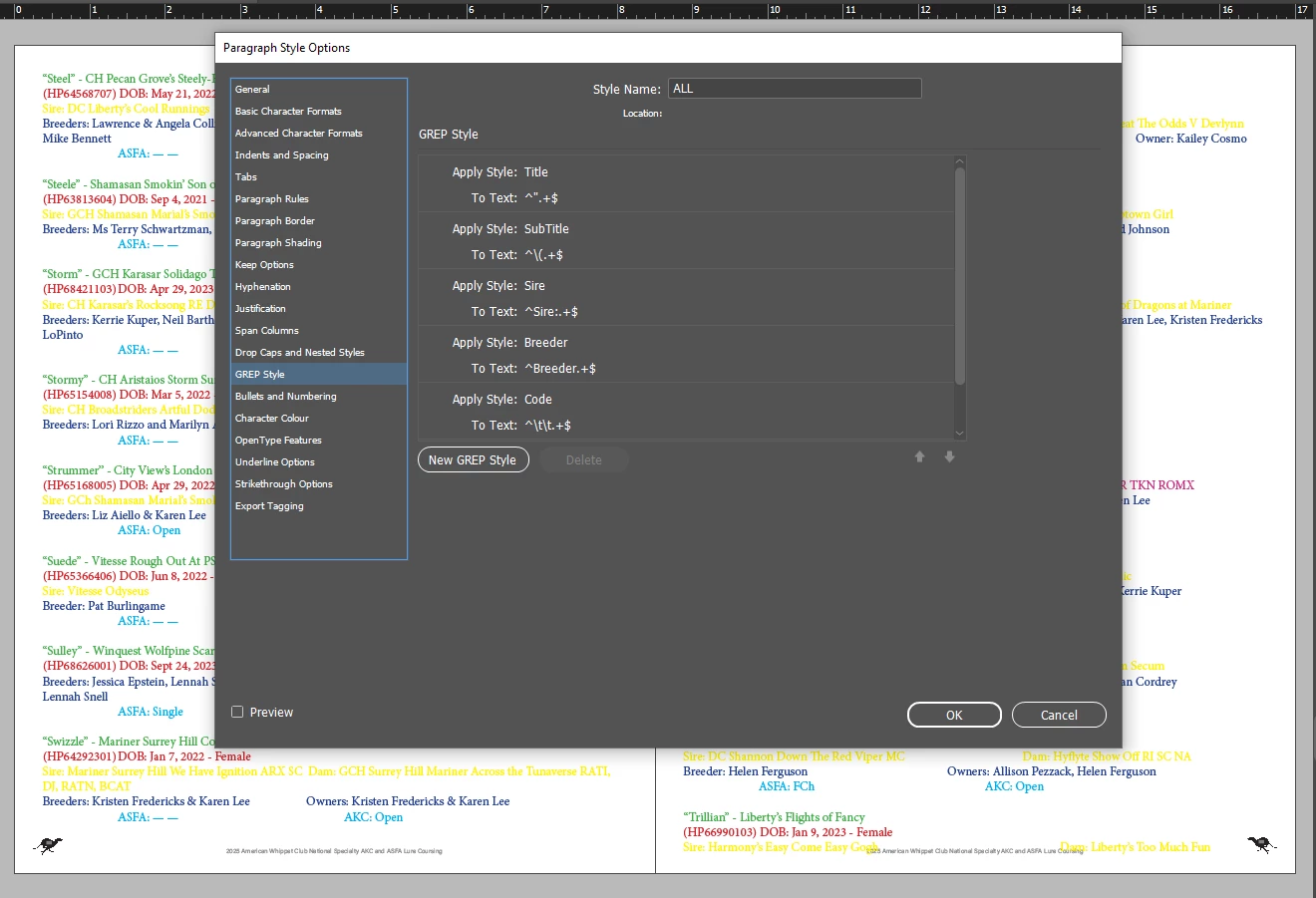 I have followed the directions in several YouTube tutorials but I'm obviously missing a step somewhere because I can't get them to work. I think the problem may lie in the drop downs for "up to" and "through" as well as the final drop down of choices to finish the line. I have tried to set up both Nested Line Style and Nested Style and neither work for me. I have done this catalog in the past by highlighting each line and selecting the style for it but that is incredibly tedious and time consuming.