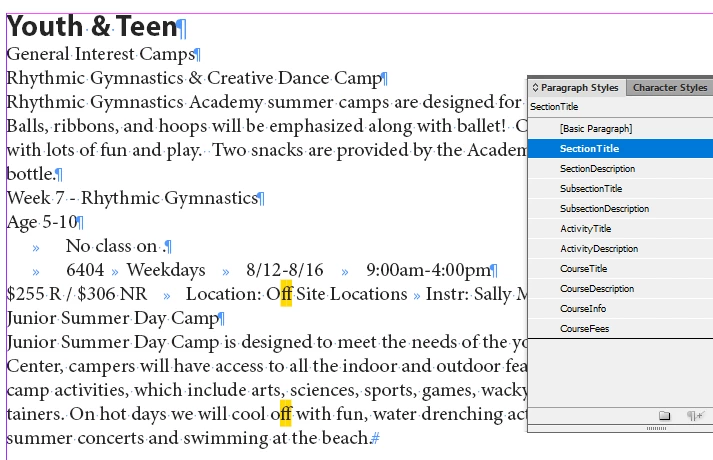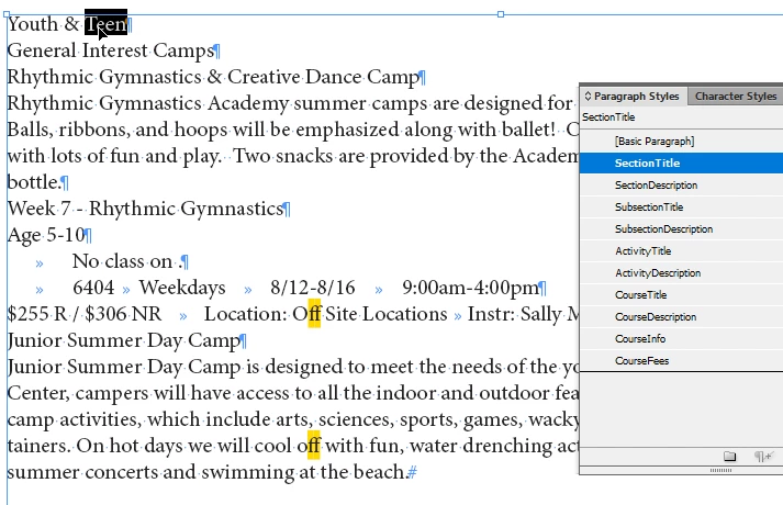 I'm familiar with the basic use of paragraph styles, but a new client has sent me copy exported directly from a program called CivicRec that ought to be mapping to my existing InDesign document's styles...but no luck.