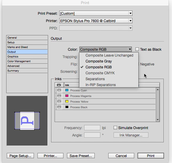 Why can I select composite cmyk color option when printing in indesign CC? There're only options for Composite RGB or Composite Gray and nothing else. I tried to uninstall the old version and updated to CC but the problem is still there. All the Adobe software in my MAC have this problem. I don't think it's printer's problem because I tried to print on both and none has this option. Does anyone know why? Please help!