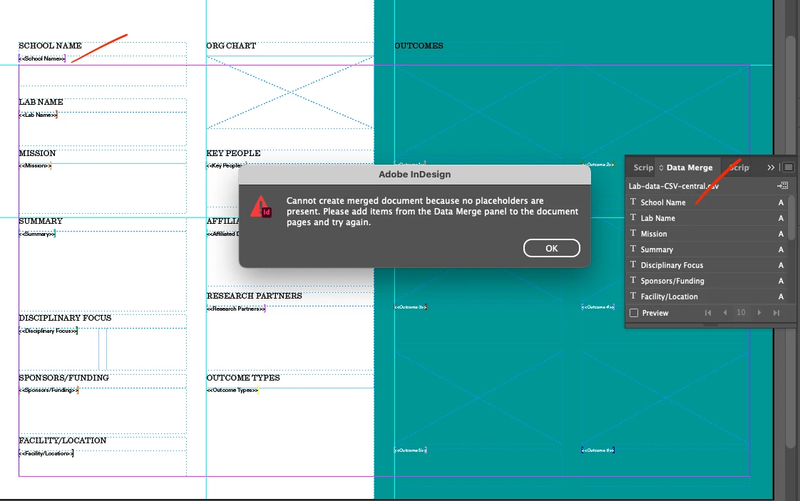 I am getting this error. But doesn't the data merge panel and screenshot of the parent indicate that there ARE placeholders ?