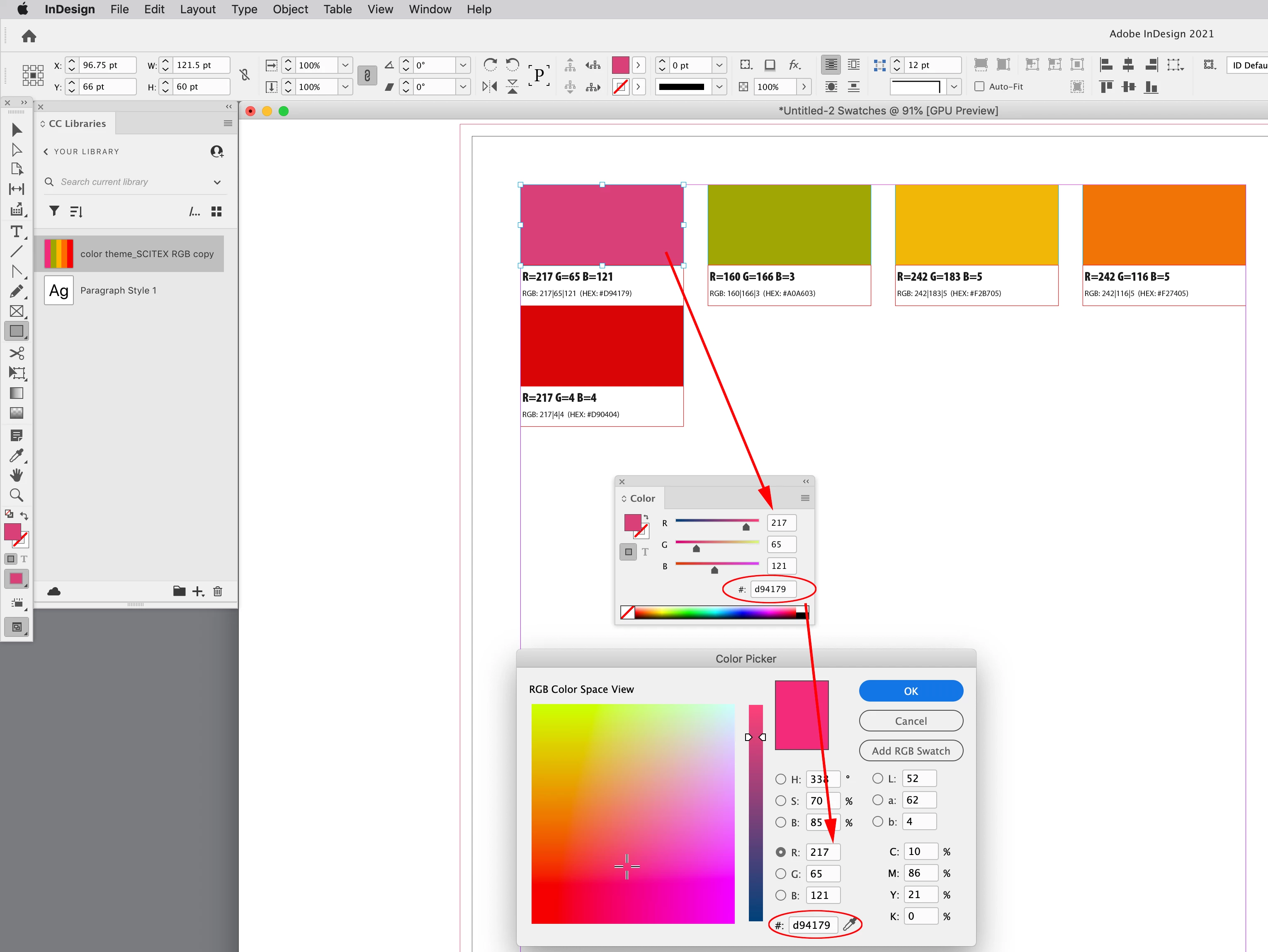 Hi @gabriela31494937ruhf , By Adobe Color i assume you are referring to the web tool at https://color.adobe.com? When you use the Extract Theme tool, the colors are listed as hexidecimal values which is simply a different way to notate RGB colors—hex values are used in HTML coding. Web HTML coded colors are displayed in the sRGB color space, so if you save the theme to one of your CC Libraries they will be added as RGB colors with an assumed RGB profile of sRGB. Set your InDesign document’s assigned RGB profile to sRGB in order to get a match to what you were seeing in the website: