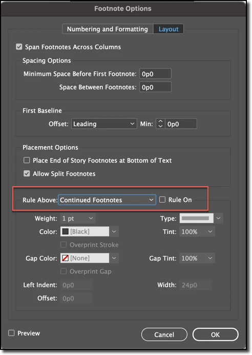You can control the visibility and appearance of the rule above the first footnote in a column, and for a continued footnote.