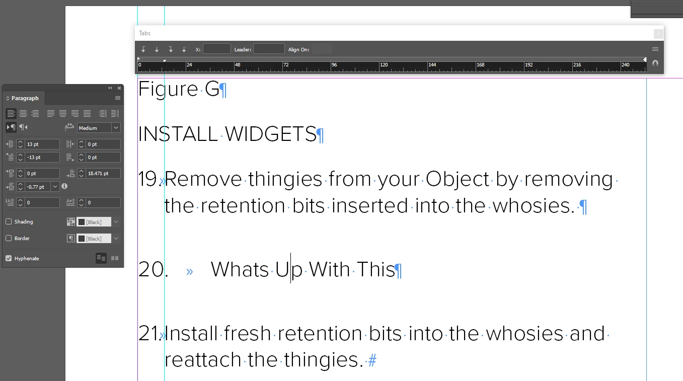 I have a document with a numbered list. For some odd reason when the list increments to 20, I'm seeing a big increase in indentation. When it increments to 21-29, it returns to normal (13, -13) but at 30, I see the increase in indentation. It doesn't happed at 10 - only 20, 30, 40, etc. There is nothing there like a shape with text wrap. I tried different left and 1st line indent values including zeroing them out, but nothing changes the bevahior. I tried creating a new paragraph style but still end up with this. I created a new text frame off canvas and each time I get to 20, 30, etc. i see the same thing happens. I tried swapping out fonts - no go. Any help would be grateful.