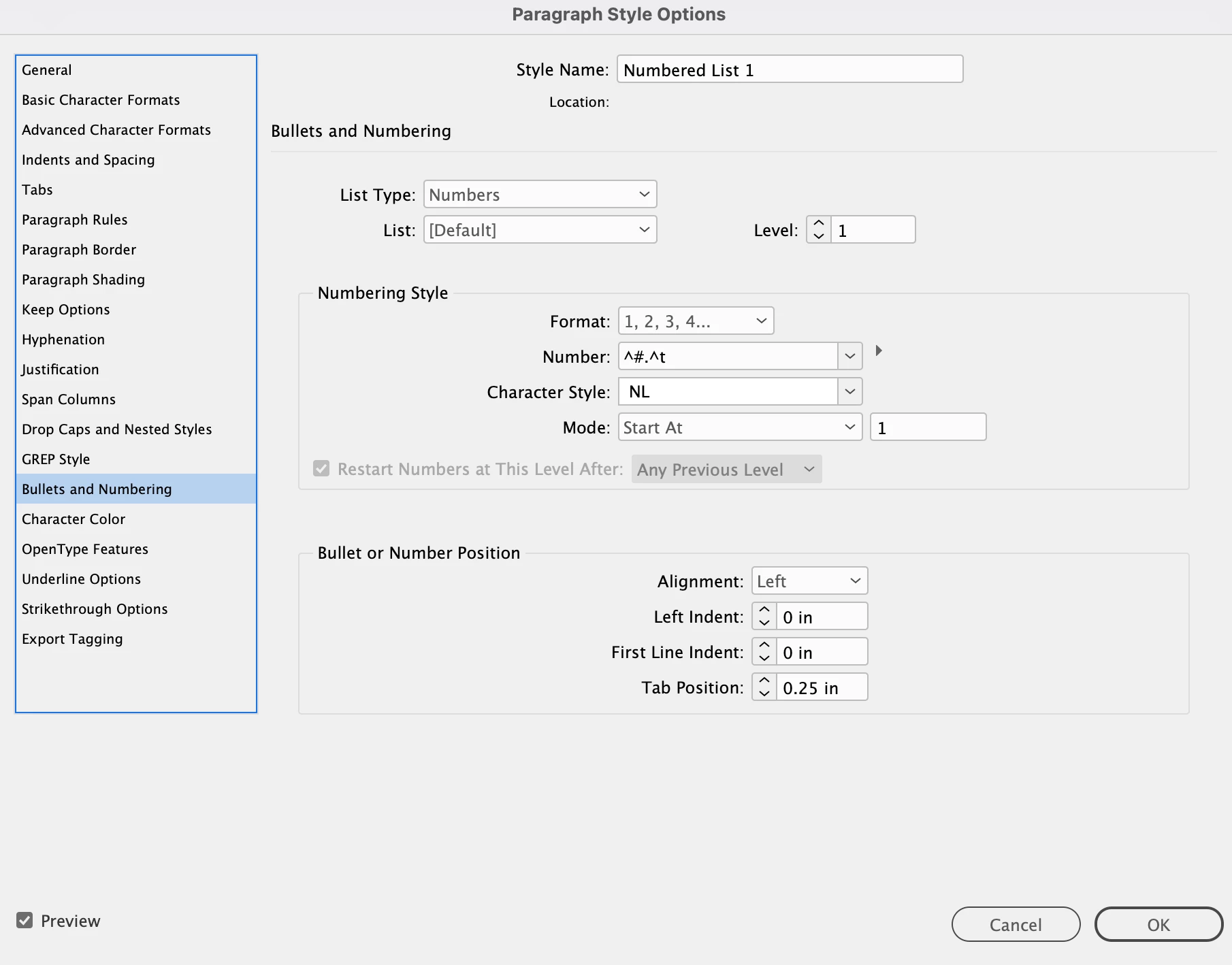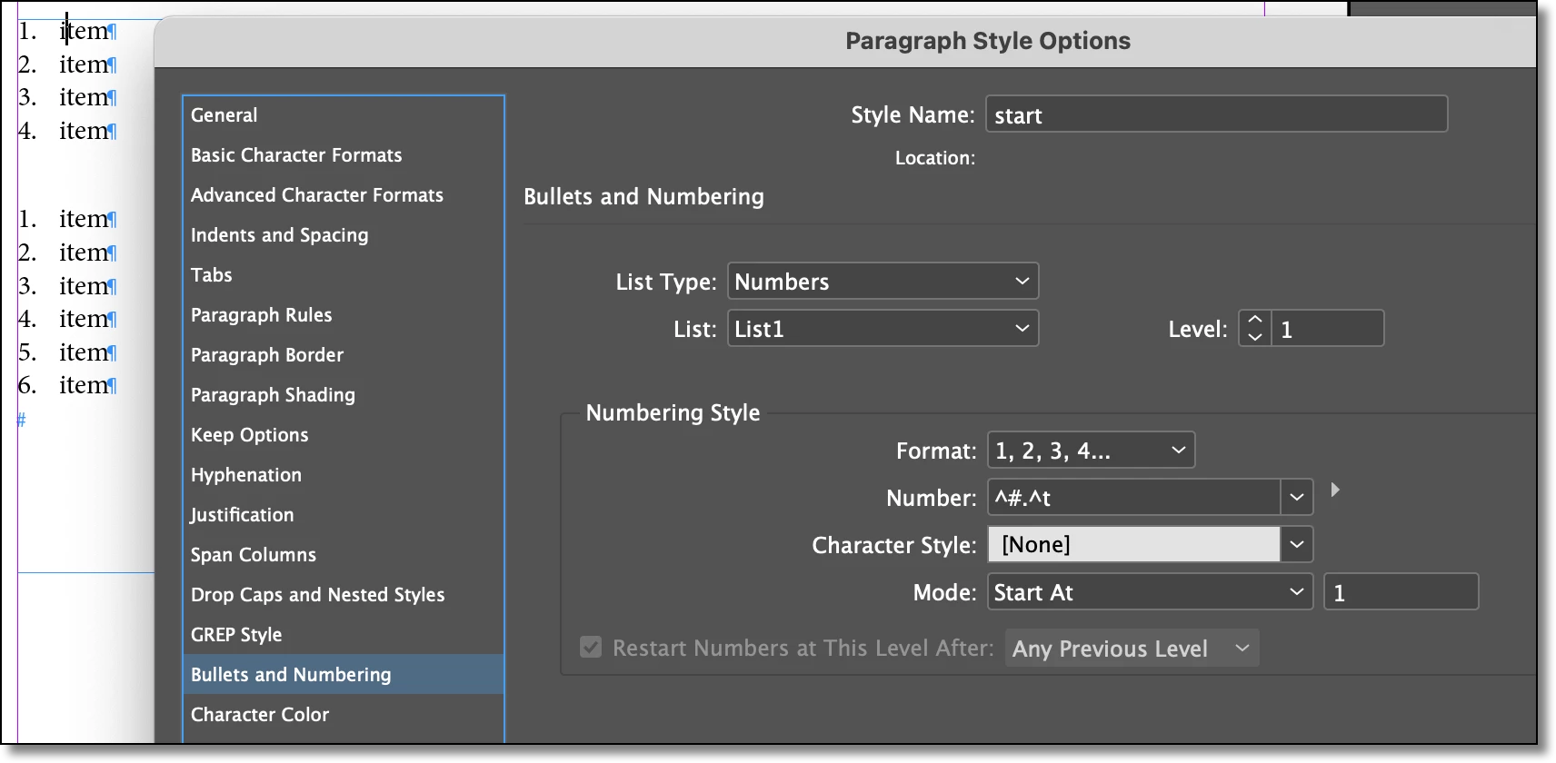 I created a numbered list Paragraph titled: Numbered List 1, the mode Start At 1. To be able to have this list continue numbering from 1 I duplicated the list, edited the Style Name: to Numbered List 1 Cont. and under Mode: I set it to: Continue from Previous.