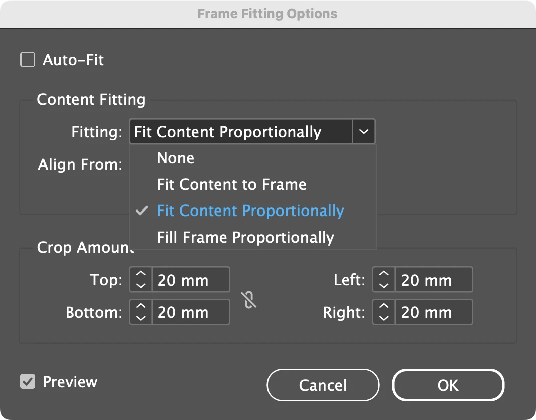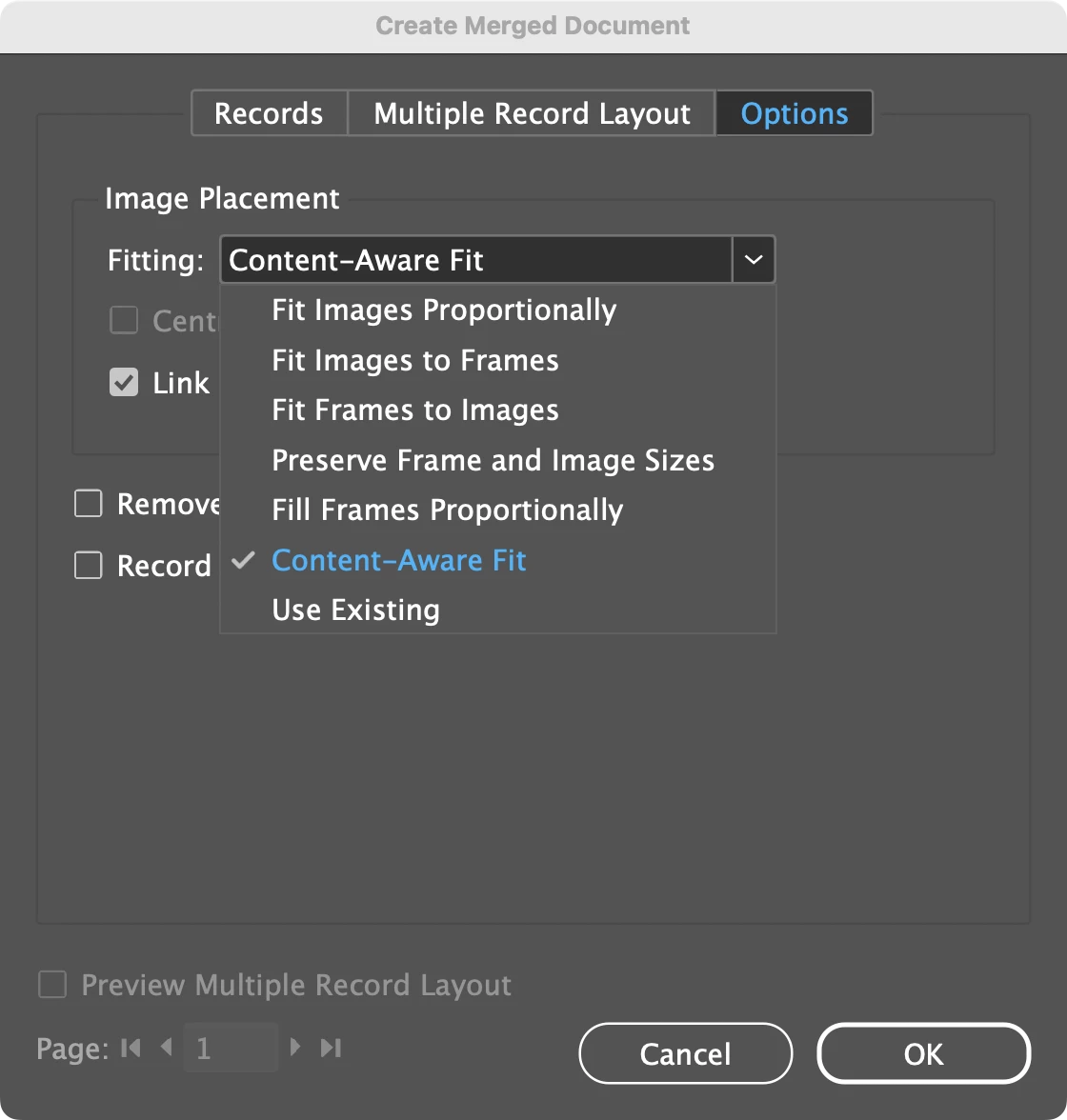 I set up my template page that is the layout I want for each record. Some linked images I change the fitting on so that it's a zoomed(viewfound) in to only a portion of the linked file. Then in my data merge panel when I hit "create merged document" the document ignores the fitting I have put on my linked images and resets all to just fit proportionally in their frames.