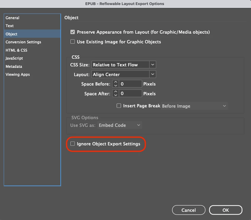 The problem is that neither the html div tag nor its corresponding css from the object style is in the html-file in the epub. The paragrapt styles is however there. How can I get the object style as an html-tag in the epub html?
