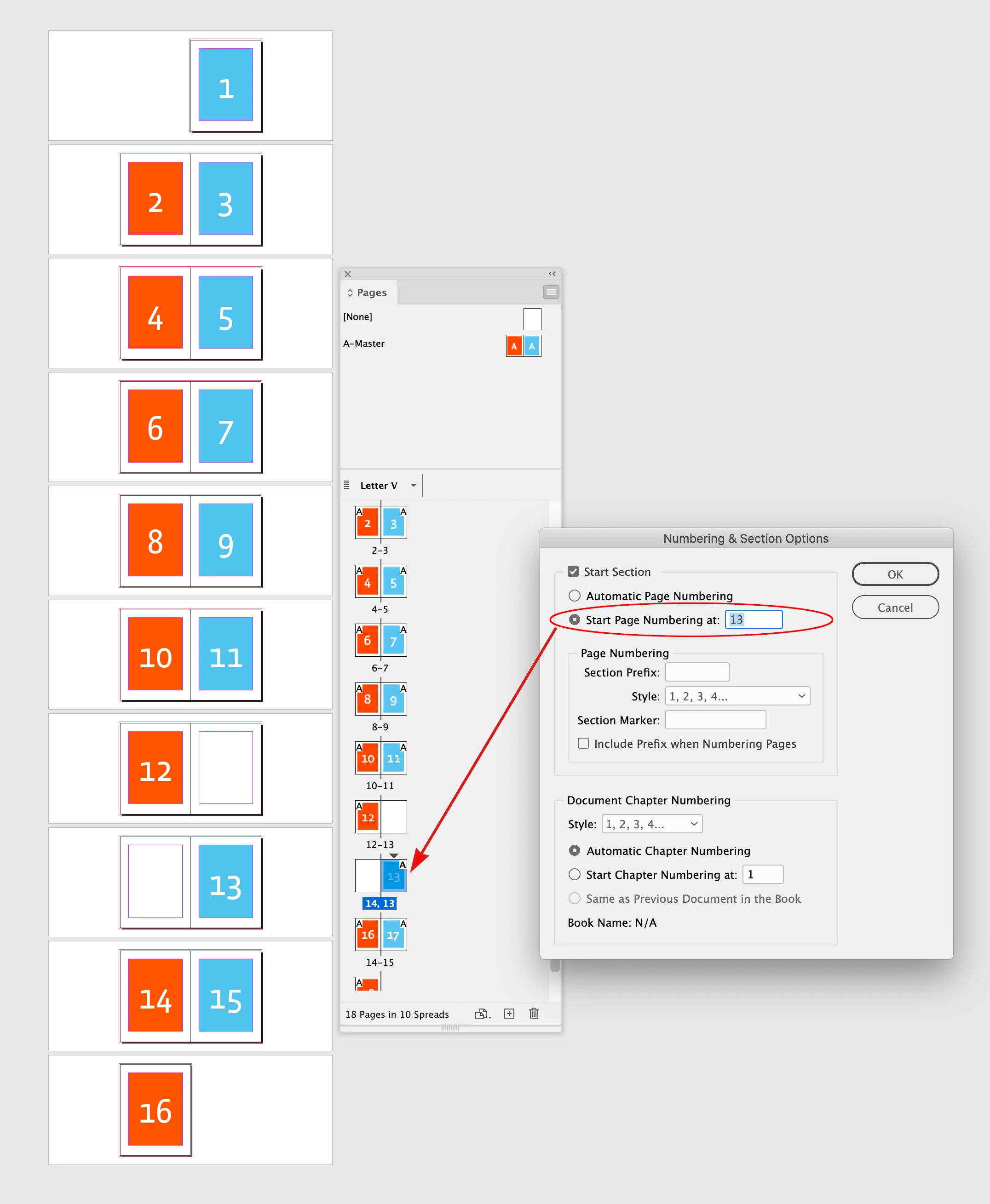 Hello, I'm searching for a way to omit a few pages in the middle of a book from the total page count. I don't mean just removing the page numbers, but completely omitting these pages from the count. So the pagination should pick up right after these pages. (Below is a mockup to describe what I mean.)