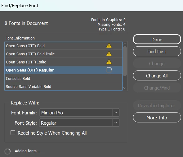 Currently, I do *not* have the Creative Cloud font installed; I just have the four instances of a static version of Open Sans installed. The document LOOKS right, it BEHAVES correctly (it doesn’t freak out if I add or delete text); but the InFlight panel says I’m missing Open Sans everywhere. And the find/replace fonts window shows a spinner, like it’s just stuck looking to add these fonts. I’ve left it for a long time and nothing ever finishes.
