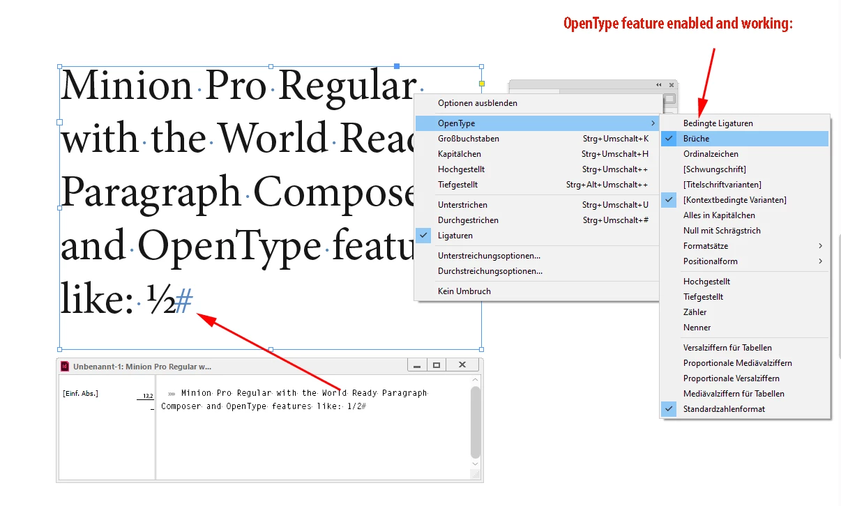 Here the OpenType feature enabled in my German InDesign ( "Brüche" ) :