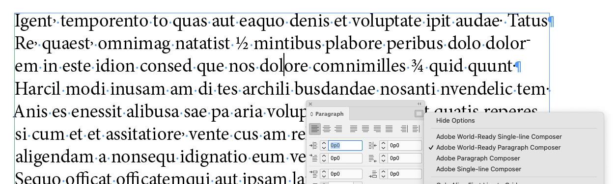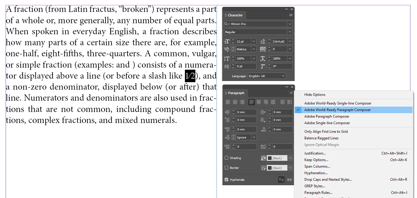 The widget for the OpenType fractions is not showing up when the Adobe World Ready Paragraph Composer is used.