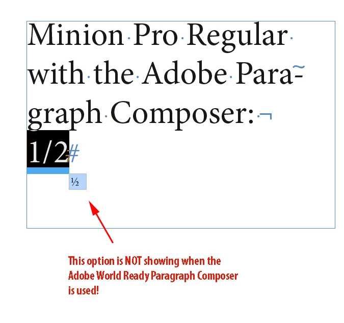 If you chosse Adobe World Ready Composer, and if we select 1/2, there will be no suggestion underneth that selection. But, if we select Adobe Paragraph Composer and select 1/2, it will shows fraction suggestions under that selection.