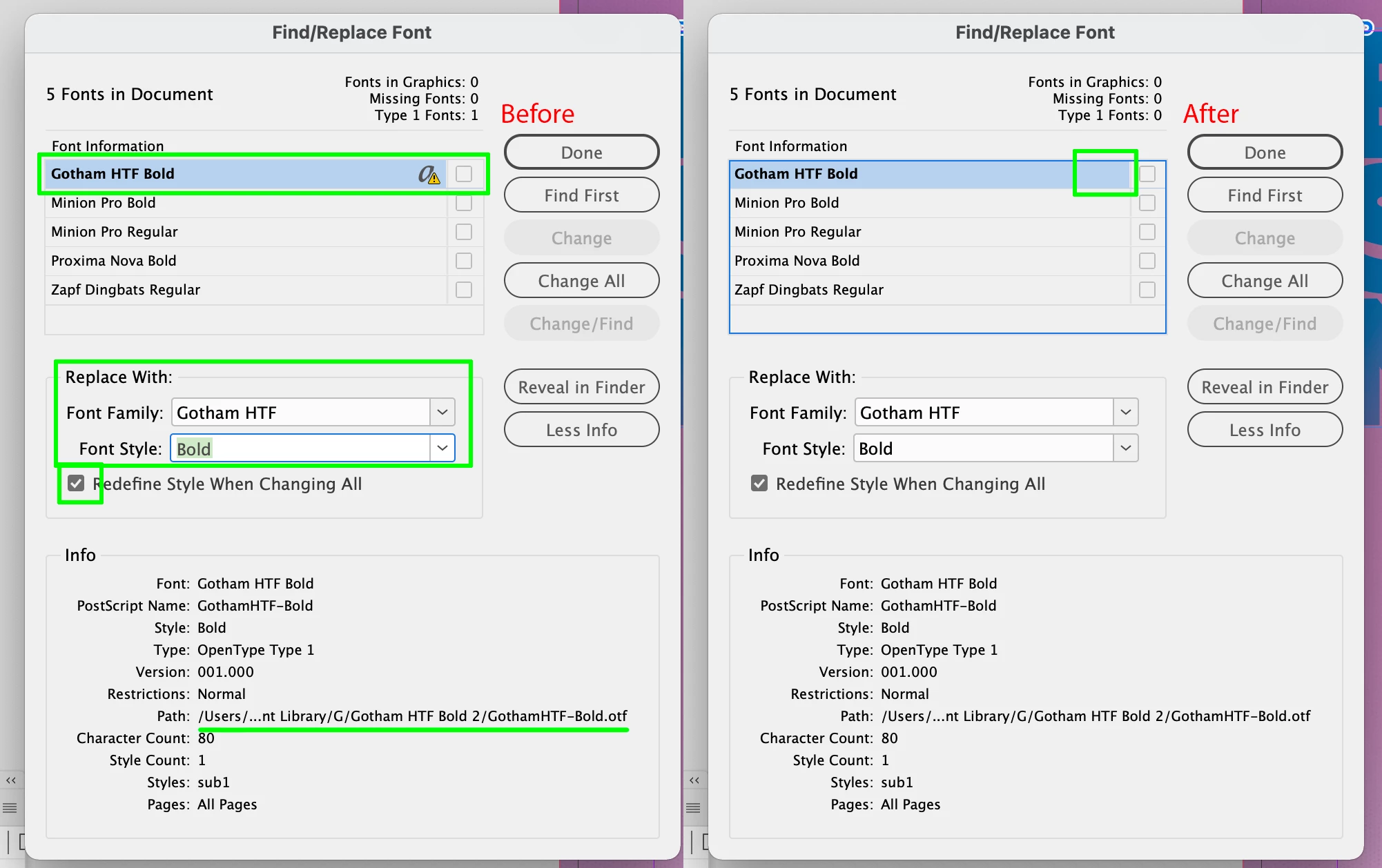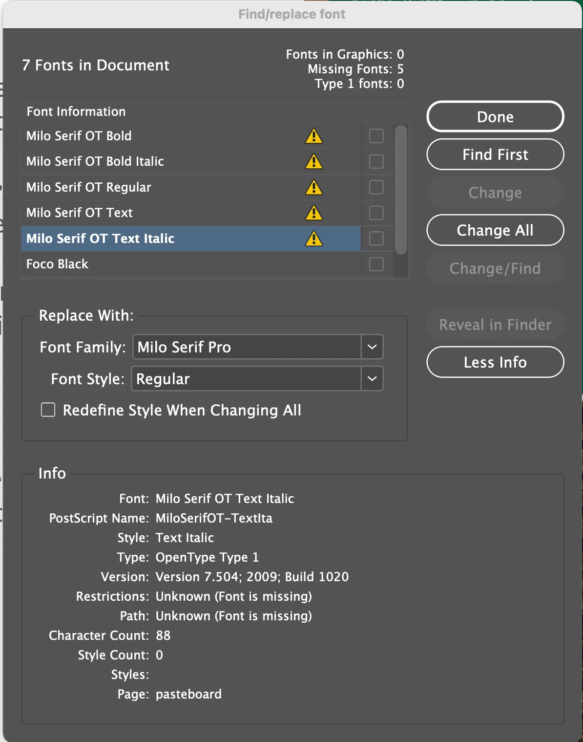 I had this issue with a legacy file as well. By appearances, my OTF fonts had "automatically" replaced the previous Type 1 ones, but it still referenced the Type 1 versions or some styles internally. A simple Find/Replace to "update" the missing fonts with themselves seemed to clear it.. e.g. in the dialog box above, Find and Replace the "missing" DTLArgoST Bold with DTLArgoST Bold, making sure the update Styles box is checked.