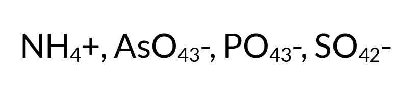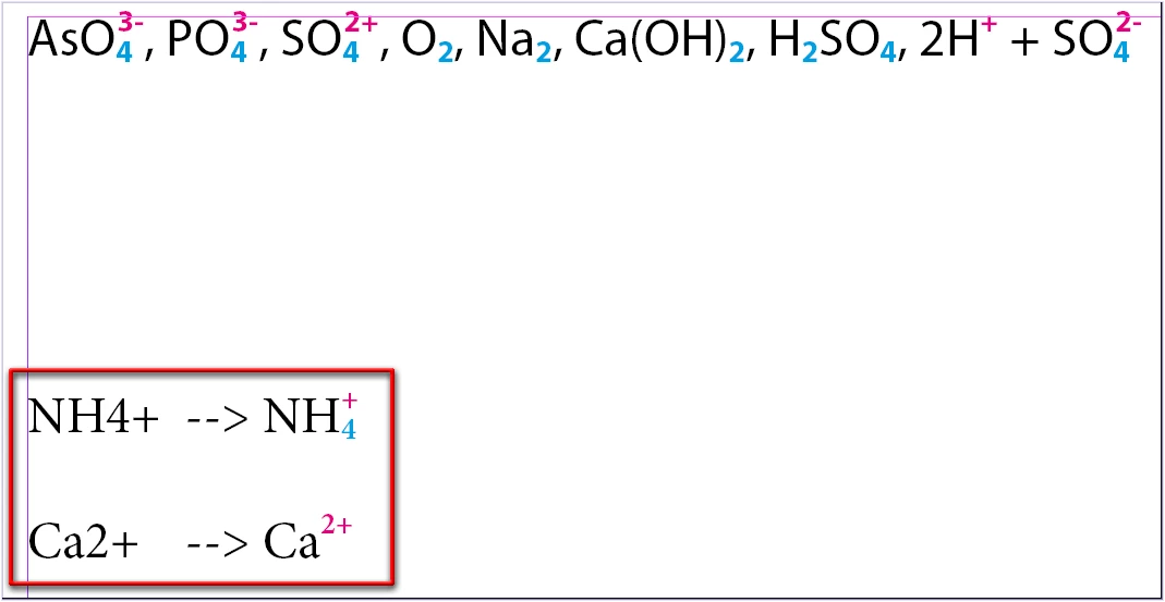 But that's not enough when I insert an advanced anions, eg. NH4+, AsO43-, PO43-, SO42-. In these examples, digits become subscripts and minuses and pluses stay on a standard level: