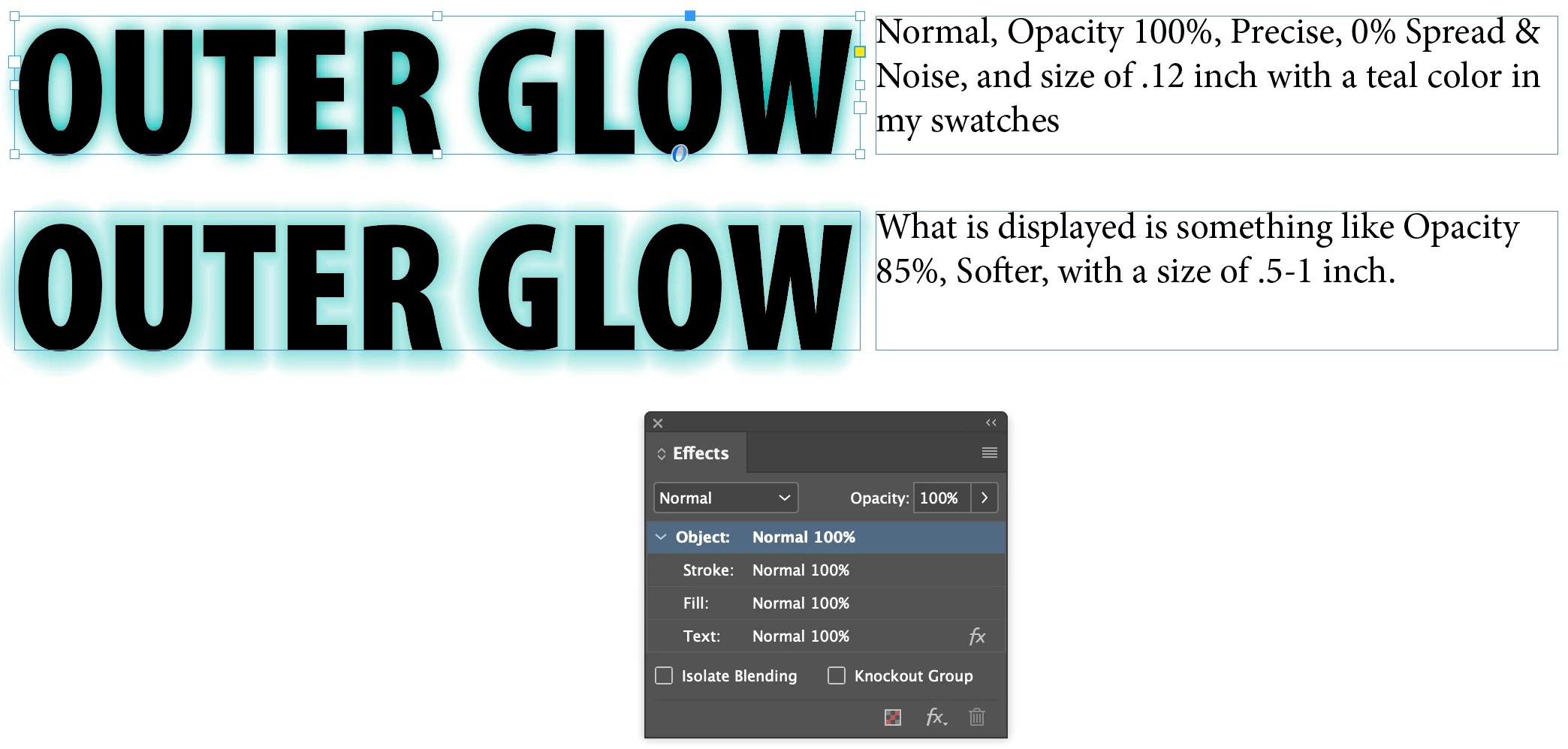 I have selected the following settings to be applied to text: Normal, Opacity 100%, Precise, 0% Spread & Noise, and size of .12 inch with a teal color in my swatches. What is displayed is something like Opacity 85%, Softer, with a size of .5-1 inch. I have removed the Outer Glow effect and placed it back several times and have copied the text box and pasted it into another indesign document and nothing works.