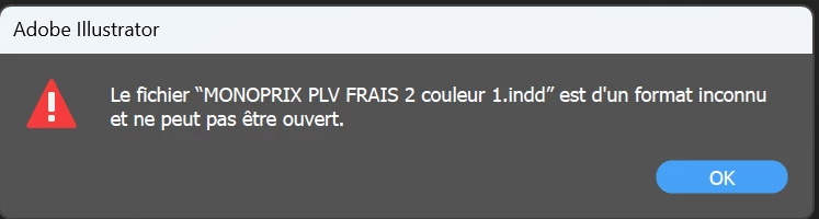 Lorsque je souhaite ouvrir un document InDesign sur l'application InDesign, j'ai ce message d'erreur qui apparaît :
