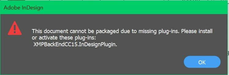 I get this error when trying to package indesign cc2020 files,   XMPBackEndCC15.InDesignPlugin  is missing.