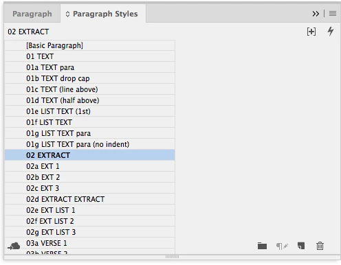 If we look at the paragraph style panel, for instance, the first column shows the paragraph styles, but the second column is empty next to the space that the paragraph styles take up, but the Quick Apply icon and the [+] icon are at the top of the 2nd column and at the bottom of the 2nd column are the Folder, Clear Overrides, New Style, and Trash icons.