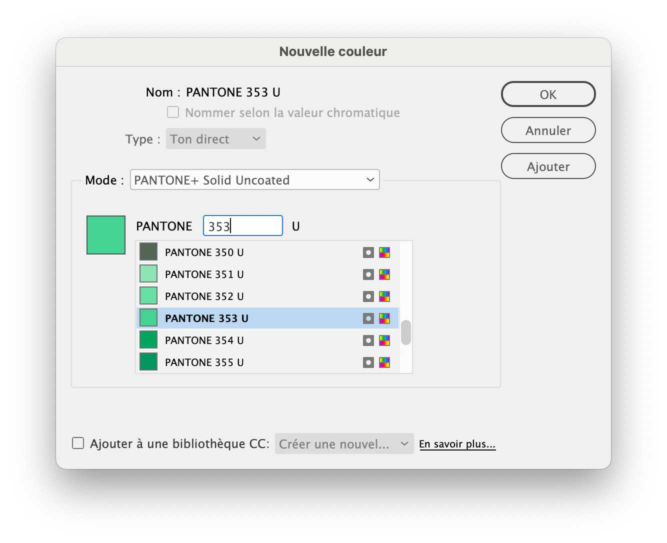 Bonjour, je n'arrive pas à trouver le pantone Uncoated 353U dans InDesign (ni dans photoshop d'ailleurs). Des idées ?