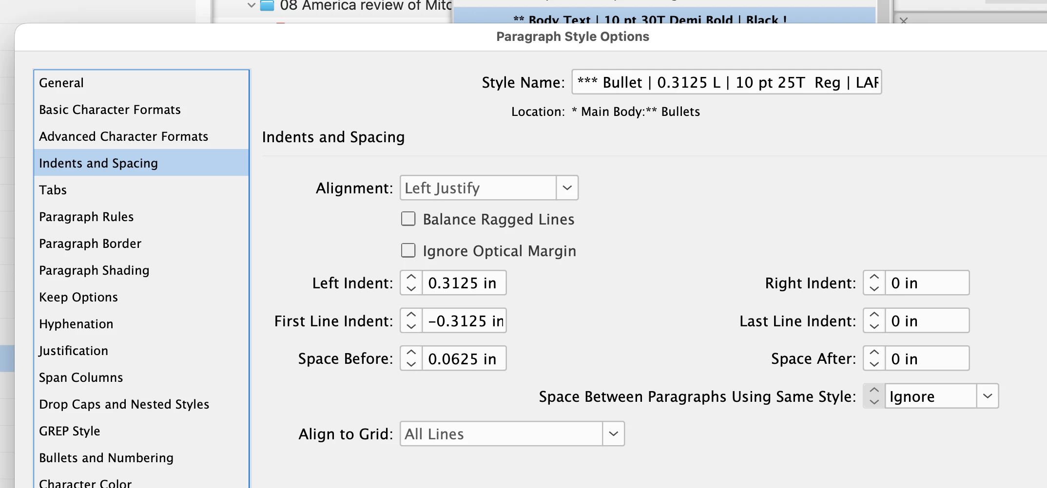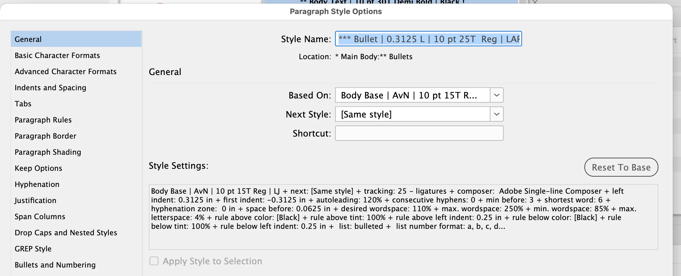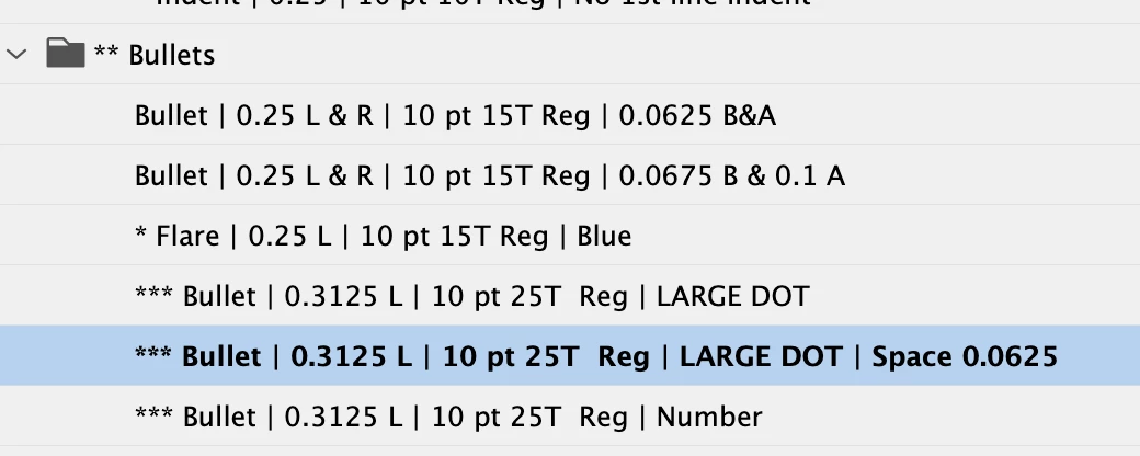 I have paragraph styles for a document I am working on. A style that I have used in the document many times has suddenly failed - it is a bullet, and attached image shows the change. I have selected the text in question, held down Option (Mac) and double clicked the style with no benefit.