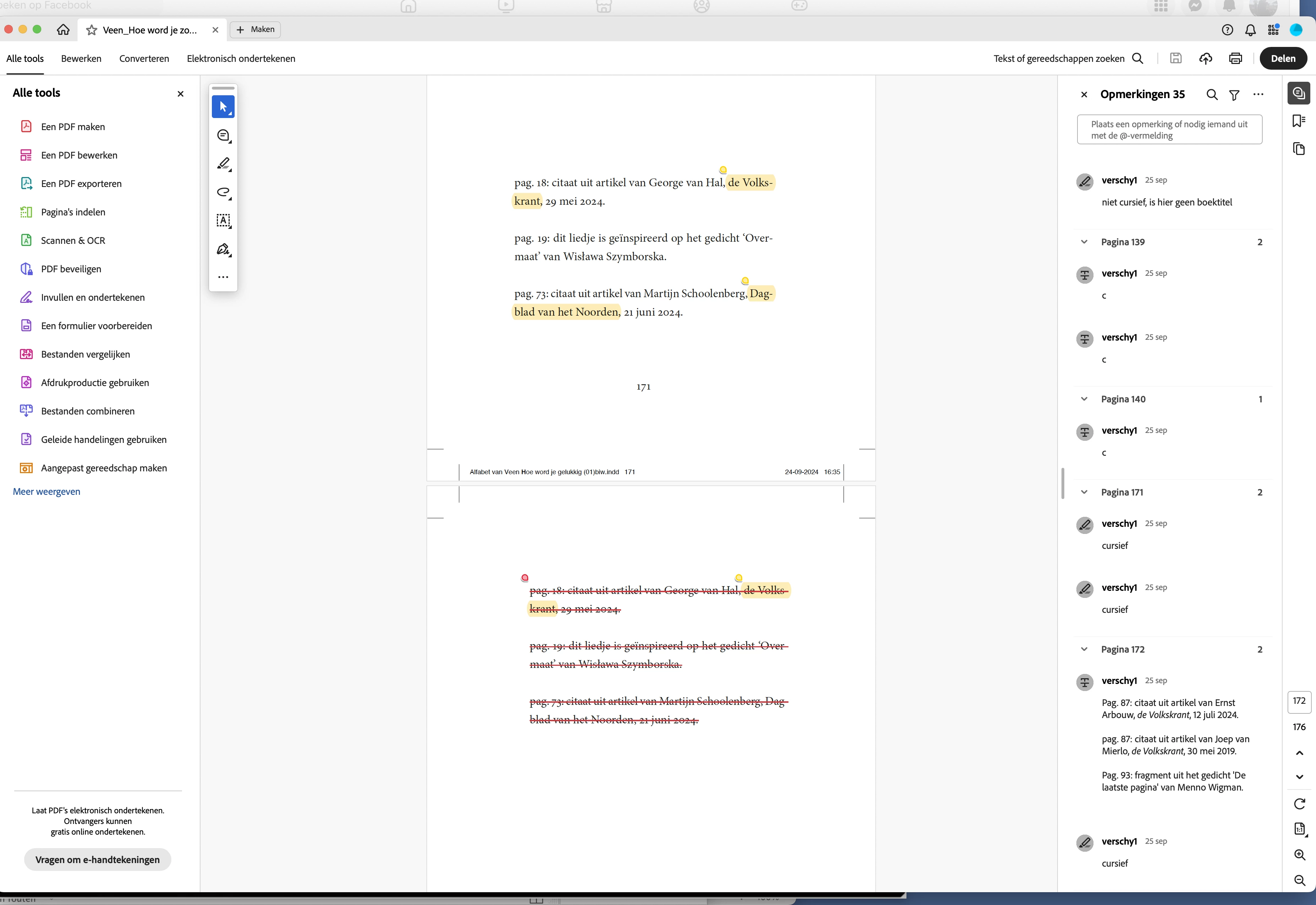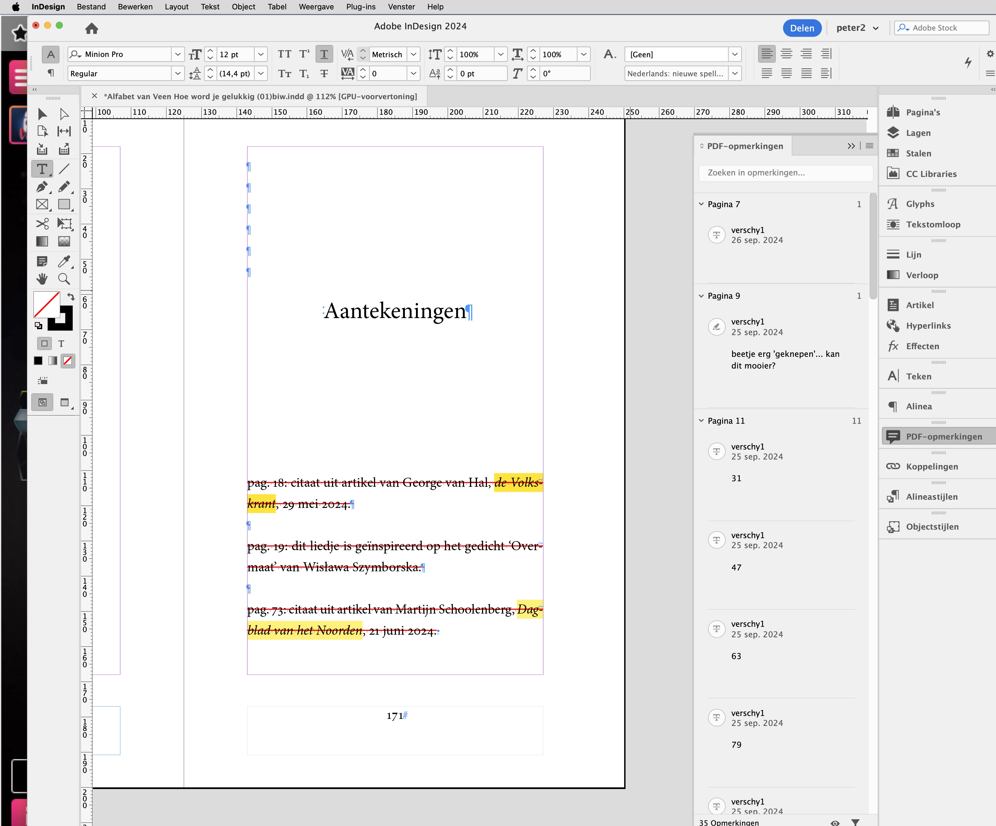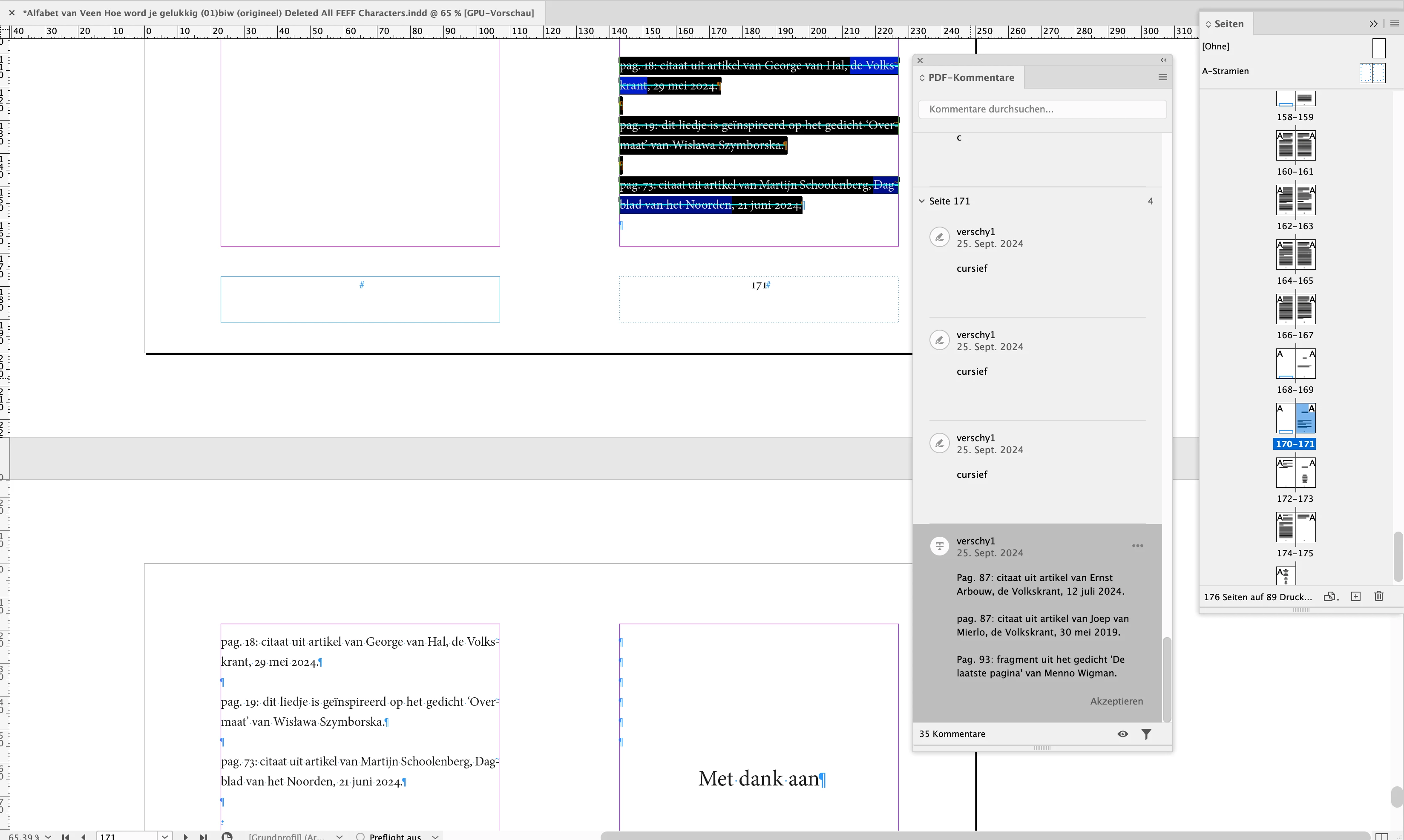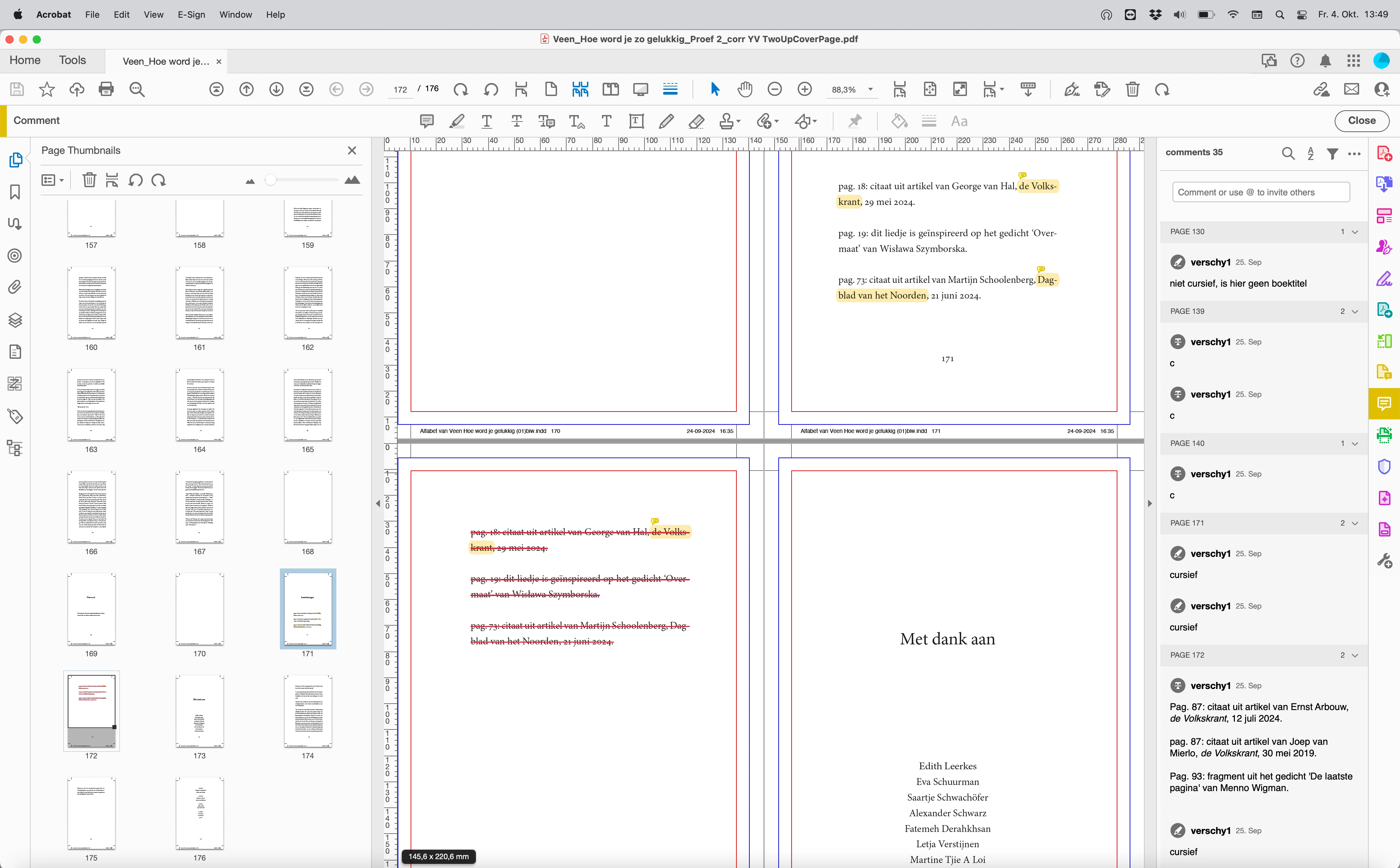 Hi, When i import a pdf with corrections in an Indesign file, sometimes the corrections are not in the right place. For example see pictures right and wrong. The imported pdf correction shows text to be deleted on page 171, when in fact it should be text deleted on page 172. Right is as the pdf in acrobat shows it, wrong is as indesign shows it when pdf is imported. Also when a correction shows a space between to letters is to be added, the actual correction is shown one letter to the right. For example gohome needs to be go home, then the pdf shows a correction after the H instead of before the H.