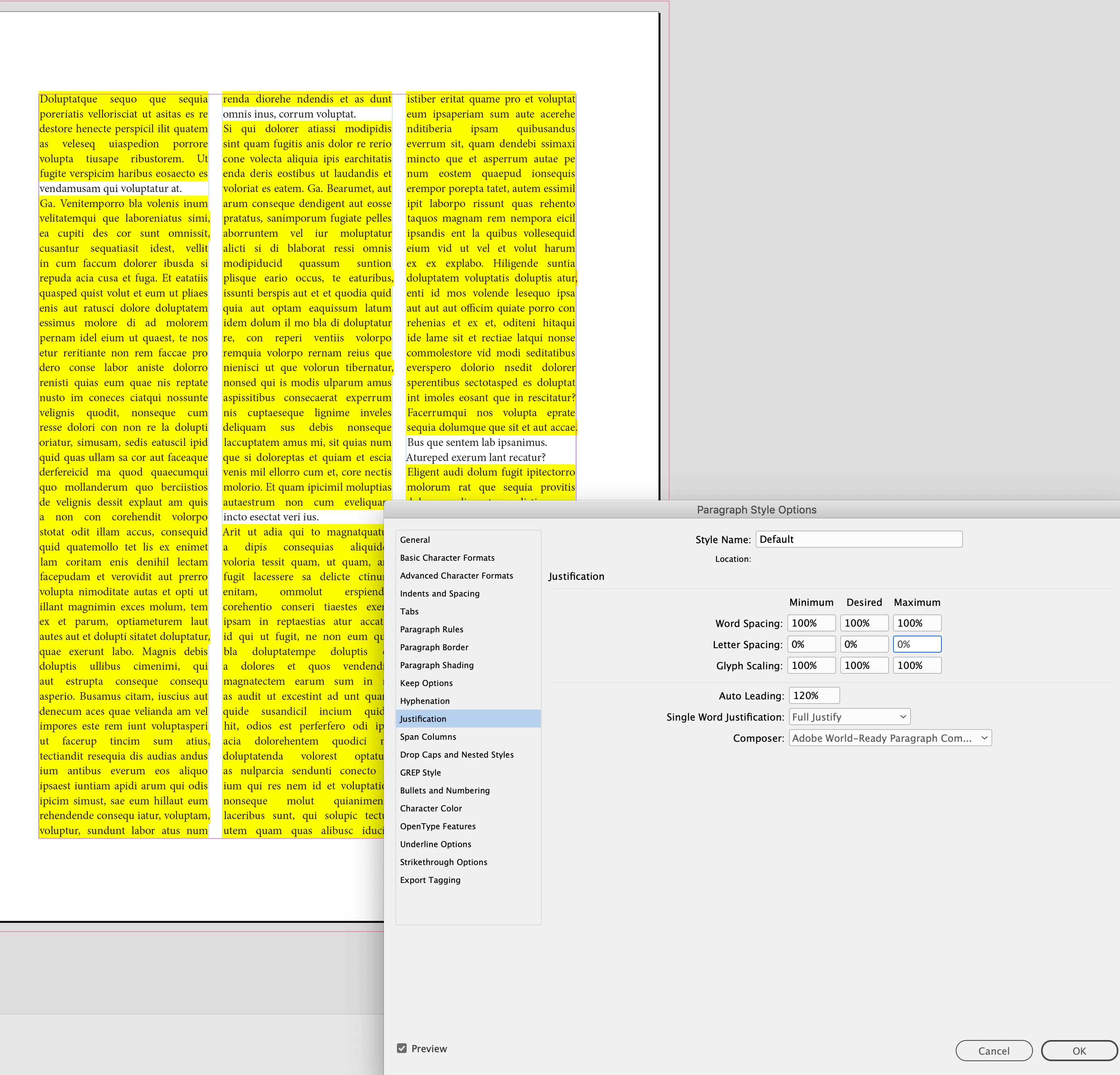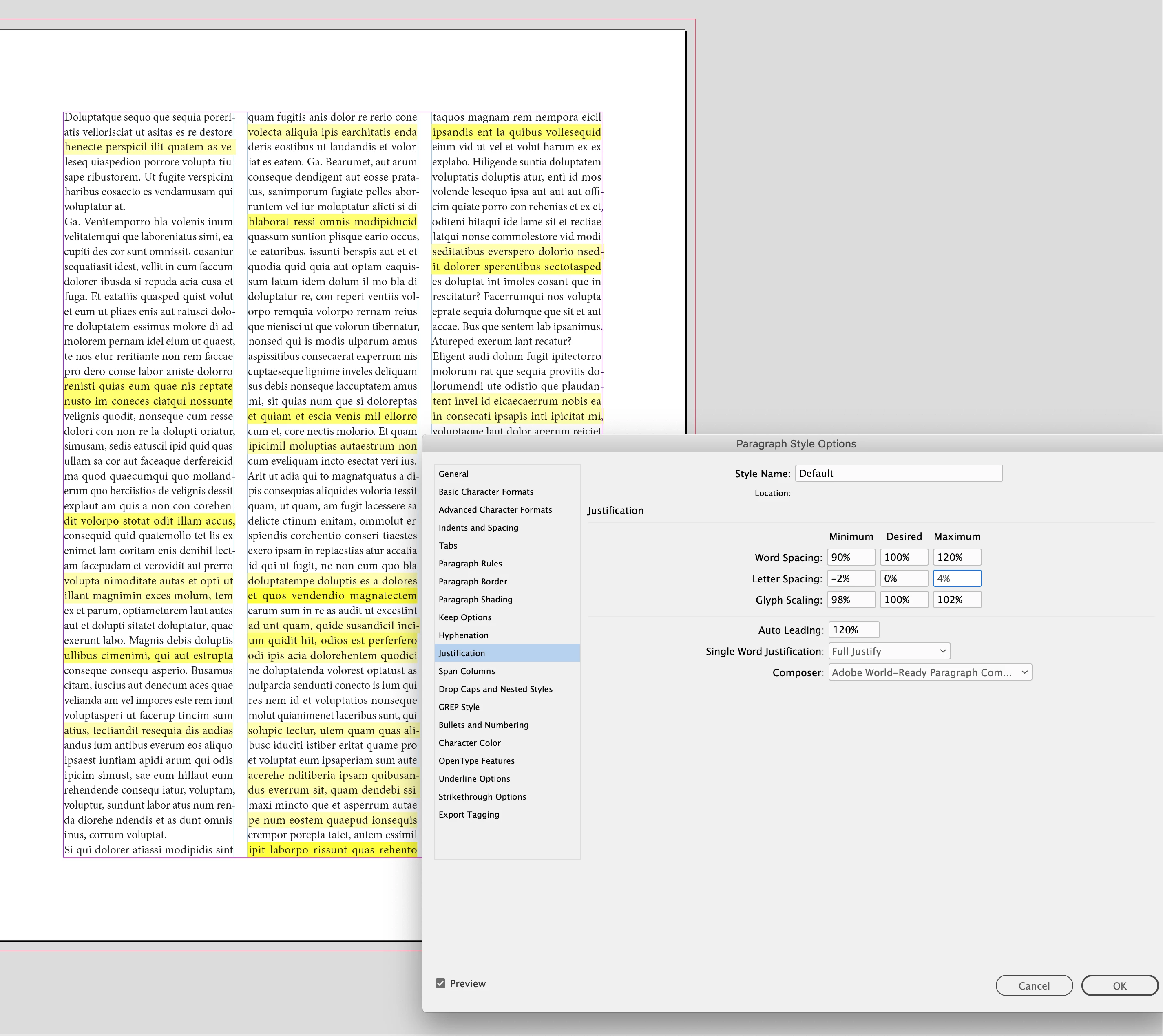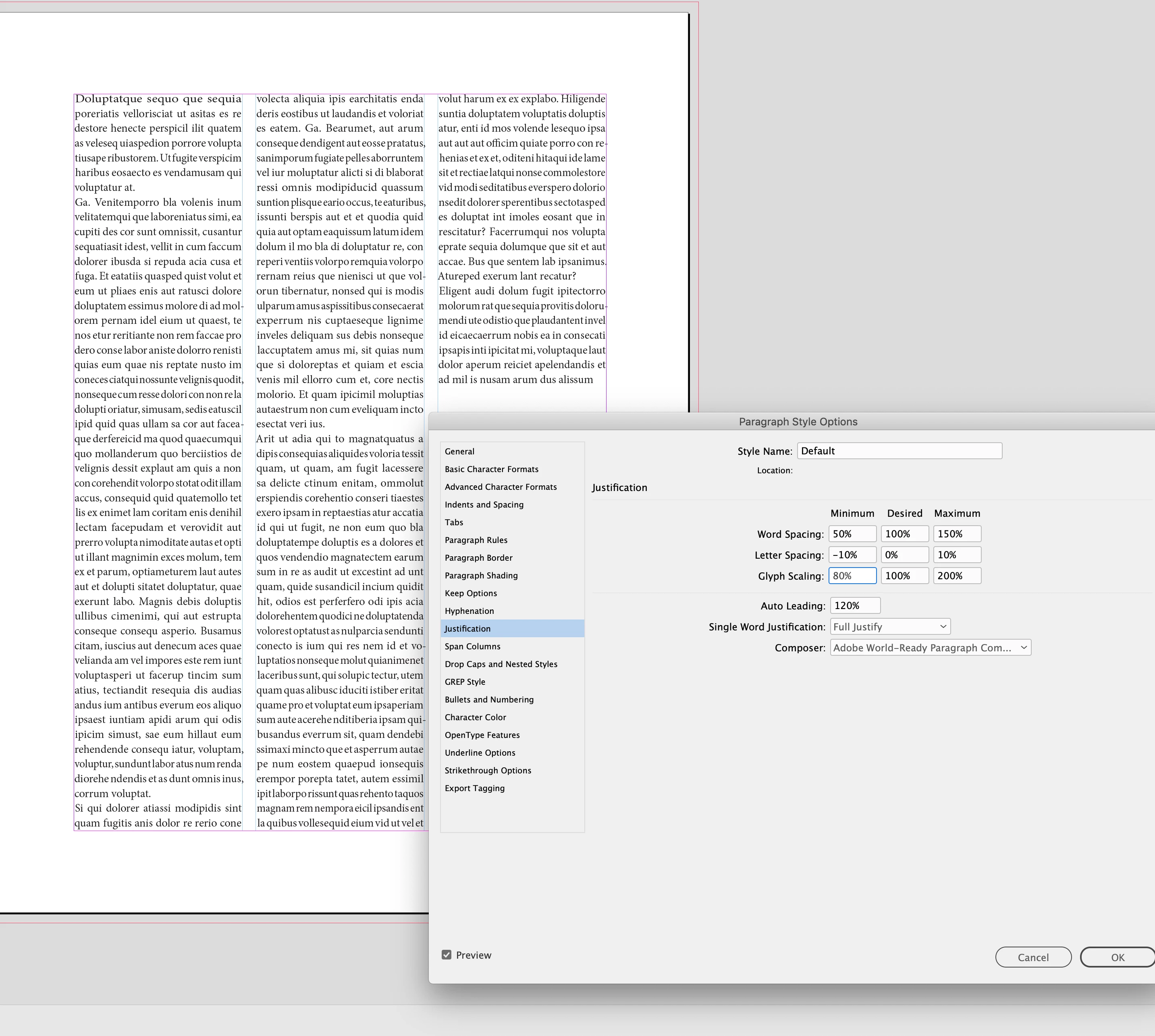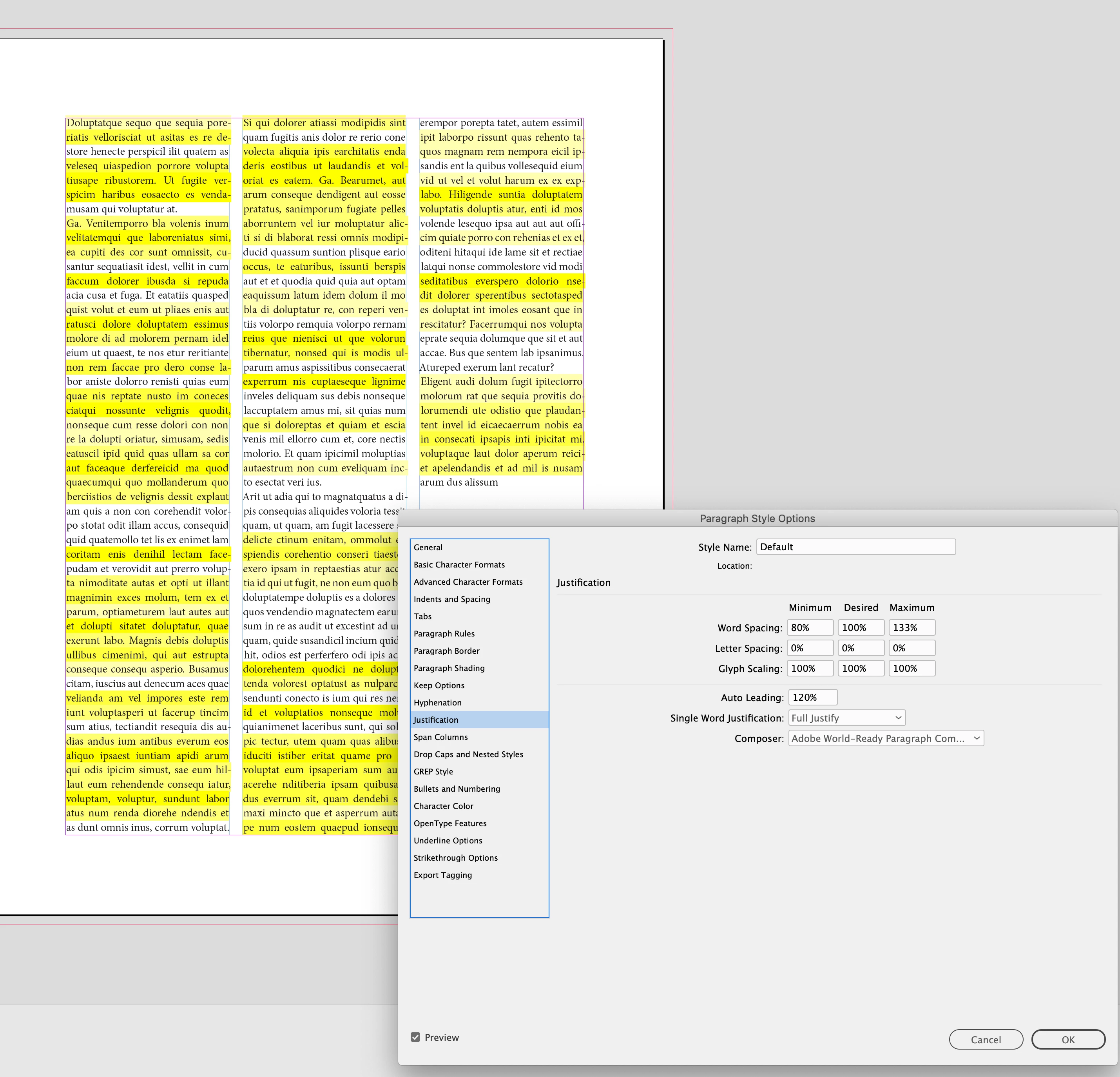 I would rethink your 105% |120% |145% Glyph scaling—it’s distorting the the horizontal scaling to the point where it would be obvious to the reader. You want the desired setting to be 100%, and only allow a slight Minimum and Maximum change so the scaling is not discernible.