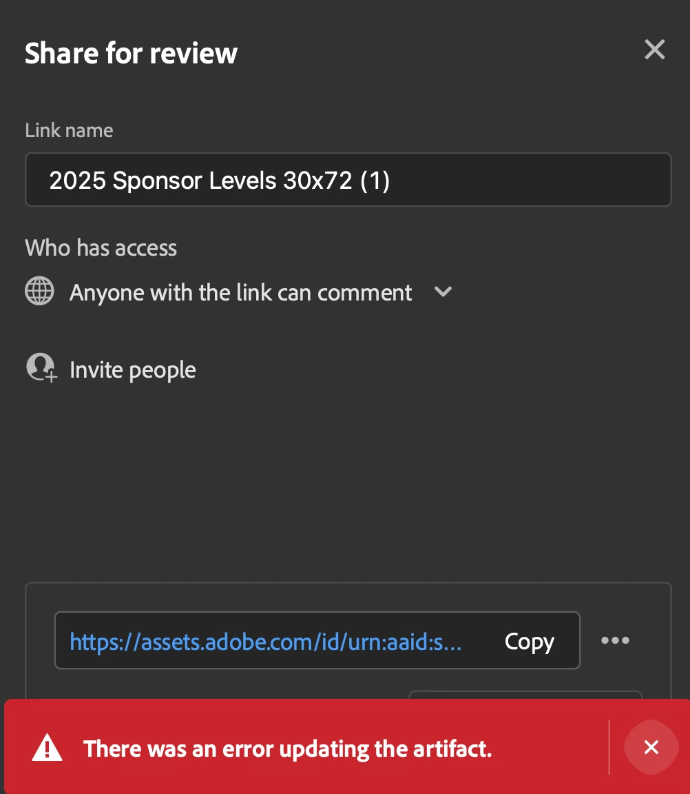 When I go to update a review link in InDesign, I keep getting this error message "there was an error updating the artifact". After that, the link does not work for most people. I am signed in to Adobe. Everything is up-to-date.... But this issue still persists. Can Adobe please fix this issue? It's emarassing when I go to send the review link to my leaders and they just get an error message when they try opening it.