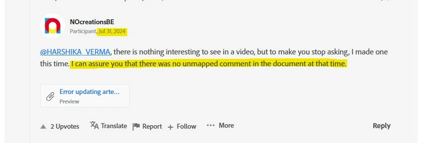 The team also noticed in one of the shared recordings that unmapped comments were present, which might be contributing to the error. They're reviewing this further, but for now, please try updating the content again and let us know if it works. If the error persists, kindly check if you notice any unmapped comments and share your observations so we can dig deeper.