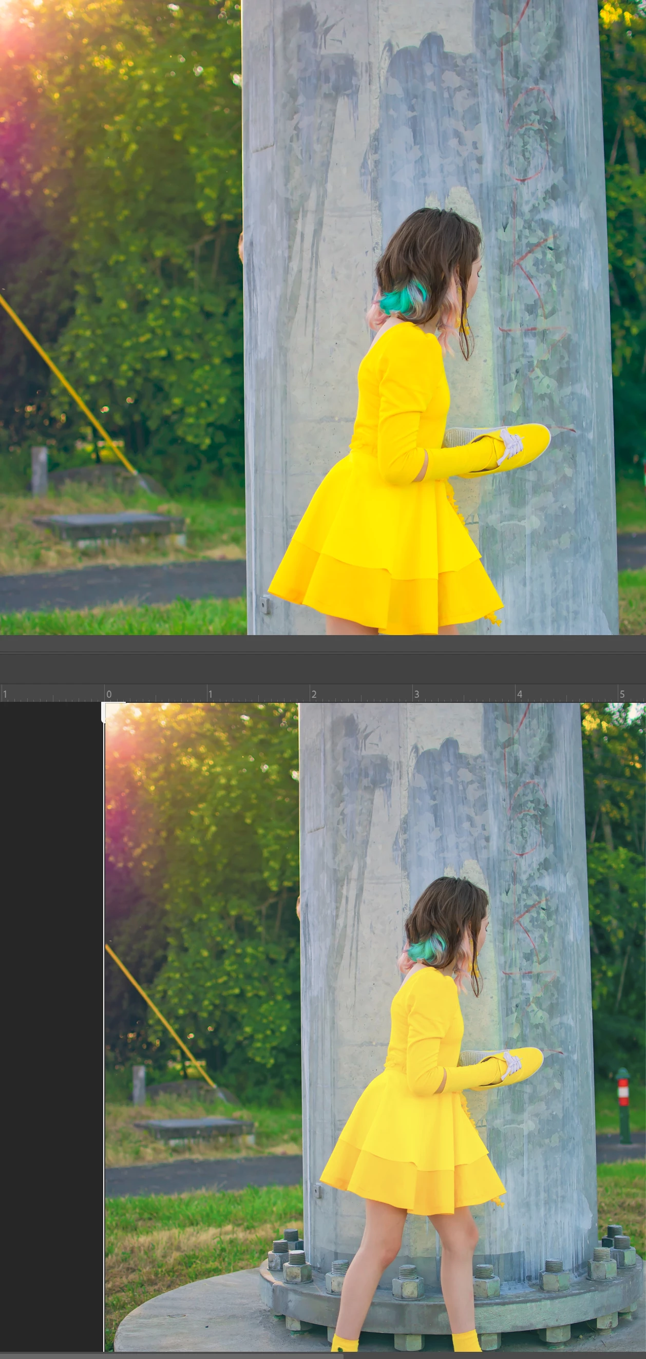 ProPhotoRGB is  a much larger color space than sRGB, so on a color conversion to sRGB, the ProPhotoRGB colors that are outside of the sRGB space are moved into the smaller space—the saturated yellows in the girl’s dress get adjusted on the conversion, while the less saturated colors in the background convert unchanged because they are not out-of-gamut.