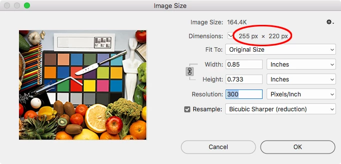 So if you check your Image Size in Photoshop its output dimensions at 300ppi are .85" x .733":